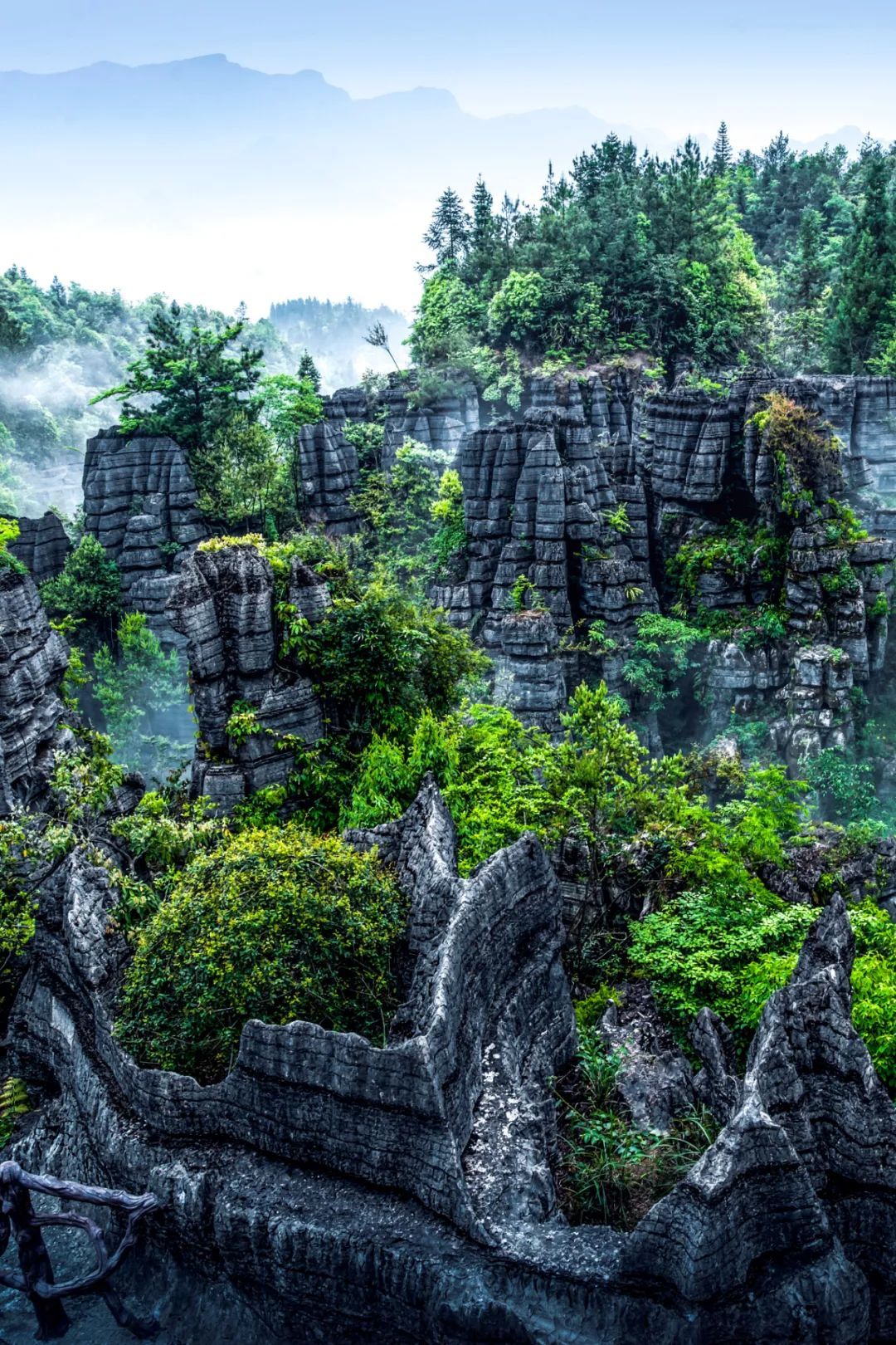 被稱(chēng)為“天然奧陶紀(jì)地質(zhì)博物館”的梭布埡石林。 攝影/文林恩施之所以這么“仙”,正是在于喀斯特地貌。這里的奇峰、絕壁、天坑、天生橋、天生柱數(shù)不勝數(shù),萬(wàn)米絕壁、千丈深淵、隱藏在深林里的瀑布群,構(gòu)成了這座天然秘境的基本形態(tài)。