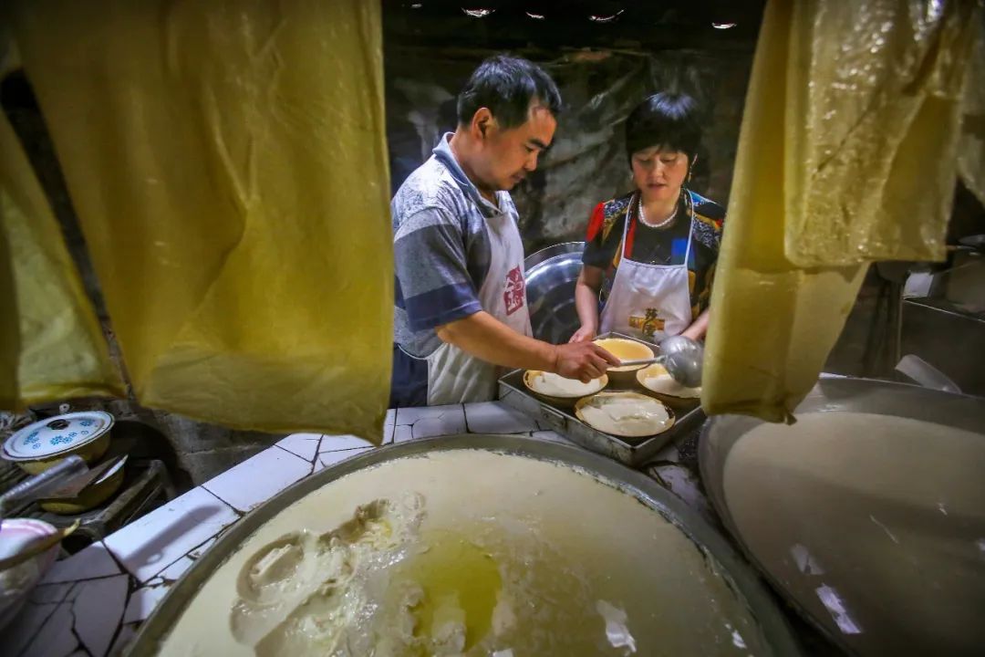 傳承著恩施傳統(tǒng)美食的手藝人,圖1為豆皮制作過(guò)程,圖二為油茶湯。