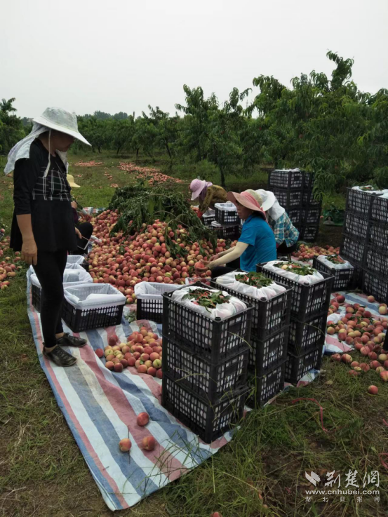 5月29日,在楊店鎮(zhèn)園藝場的桃園里,果農(nóng)們正在果園里穿梭采摘成熟的桃子,桃園里一片繁忙景象。附近的代收點、交易市場也是車水馬龍、人聲鼎沸,幾十名村民正將鮮桃按照大小、重量、顏色分揀,準備打包裝箱,運輸桃子的車輛正在排隊等待收購。