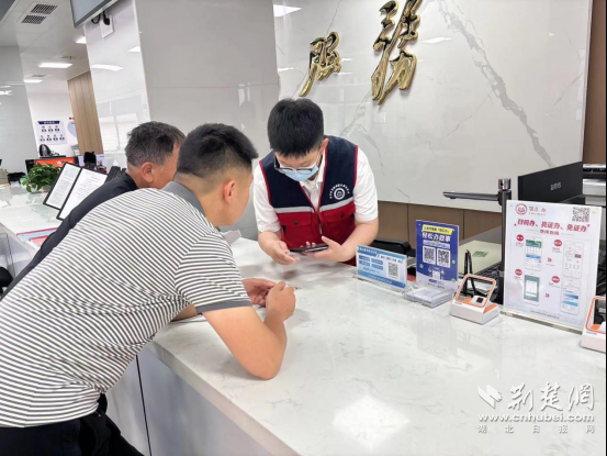 肖港鎮(zhèn)便民服務(wù)中心工作人員對(duì)辦事群眾進(jìn)行幫辦服務(wù)