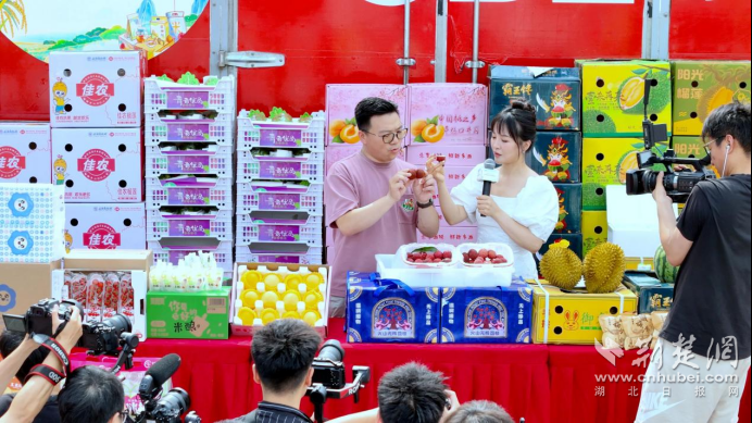 活動(dòng)現(xiàn)場,設(shè)置了農(nóng)特產(chǎn)品展示區(qū)和電商直播區(qū)。在直播區(qū),首衡集團(tuán)跟京東集團(tuán)合作設(shè)立的京東超市“家鄉(xiāng)好味”直播間開啟首場直播,直播達(dá)人向觀眾展示、介紹血桃、米酒、榴蓮等農(nóng)特產(chǎn)品,并送出福利好貨大禮包;孝感文旅達(dá)人還向大家推薦了孝感農(nóng)特產(chǎn)品、著名文旅景點(diǎn),宣傳孝文化。在農(nóng)特產(chǎn)品展示區(qū),首衡城商戶代表向線上線下觀眾介紹了無核荔枝、榴蓮、菠蘿蜜等首衡好物,吸引現(xiàn)場觀眾品嘗購買。