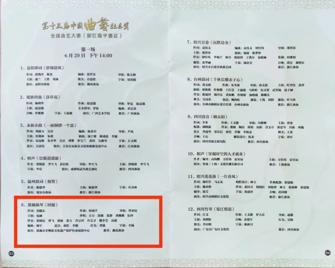 本次入圍的恩施揚(yáng)琴《回報(bào)》由湖北省曲藝家協(xié)會選送,恩施市非遺保護(hù)傳承展演中心創(chuàng)作、表演,決賽現(xiàn)場與來自廣西、江西、四川、上海、浙江等全國各地的46個(gè)曲藝類節(jié)目同臺競技,現(xiàn)場名家云集,精品薈萃,共同呈現(xiàn)了一場精彩紛呈的曲藝盛宴。