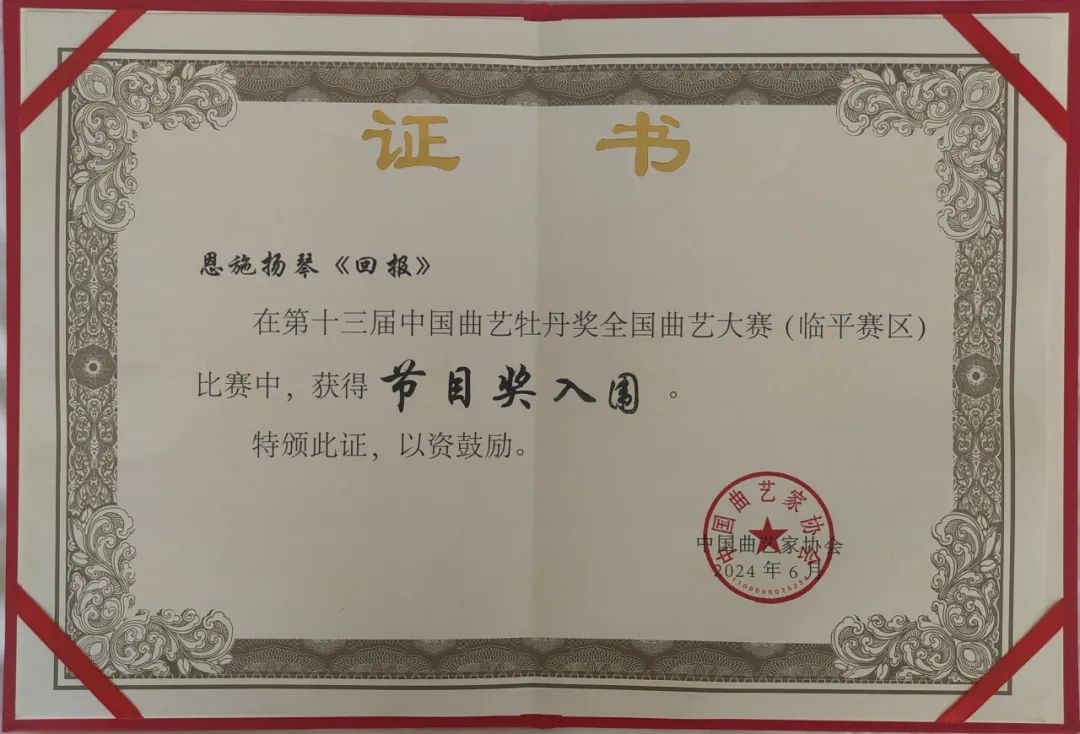 中國曲藝牡丹獎(jiǎng)是由國家部委批準(zhǔn)設(shè)立的常設(shè)全國性文藝獎(jiǎng),由中國文學(xué)藝術(shù)界聯(lián)合會、中國曲藝家協(xié)會舉辦的全國性曲藝藝術(shù)專業(yè)獎(jiǎng)項(xiàng),是曲藝界的最高獎(jiǎng),每兩年評選一屆。據(jù)介紹,本屆牡丹獎(jiǎng)評選共有465個(gè)節(jié)目參評,涵蓋122個(gè)南北曲種,恩施揚(yáng)琴《回報(bào)》是本屆牡丹獎(jiǎng)湖北省唯一入圍的“鼓曲唱曲類”節(jié)目獎(jiǎng),州級代表性傳承人、主唱包涵入圍表演獎(jiǎng)。