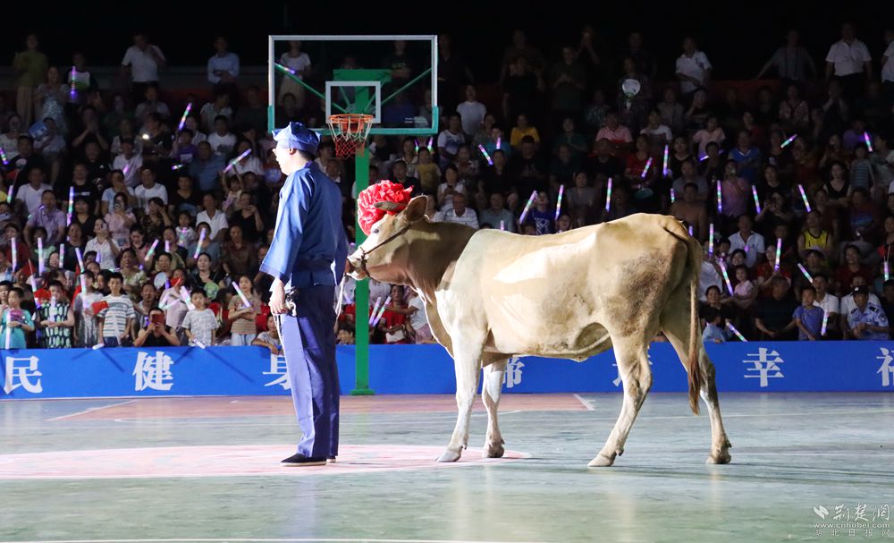 19時30分許,開幕式開始,聲聲震天的威風鑼鼓、剛勁有力的武術(shù)表演、青春動感的健身舞蹈以及活力十足的歌曲串燒,一次次引來現(xiàn)場的歡呼喝彩。當工作人員牽著“冠軍?!边M入場地那一刻,現(xiàn)場的熱烈氛圍再次被引向高潮。
