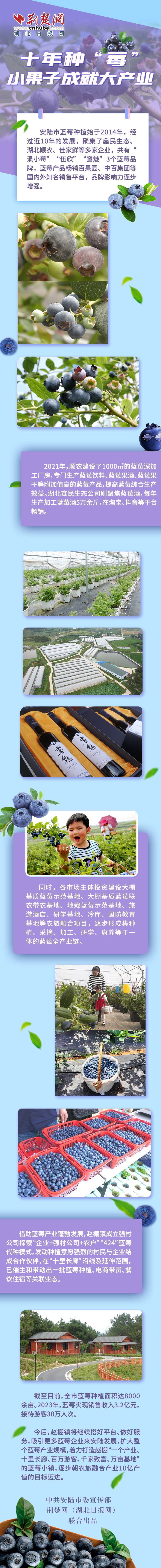 安陸市藍(lán)莓種植經(jīng)過(guò)近10年的發(fā)展,聚集了鑫民生態(tài)、湖北順農(nóng)等多家企業(yè),種植面積達(dá)8000余畝,實(shí)現(xiàn)銷售收入3.2億元,接待游客30萬(wàn)人次,不斷做強(qiáng)三產(chǎn)融合產(chǎn)業(yè)鏈,打造趙棚“一個(gè)產(chǎn)業(yè)、十里長(zhǎng)廊、百萬(wàn)游客、千家致富、萬(wàn)畝基地”的藍(lán)莓小鎮(zhèn),朝農(nóng)旅融合產(chǎn)業(yè)10億產(chǎn)值的目標(biāo)邁進(jìn)。