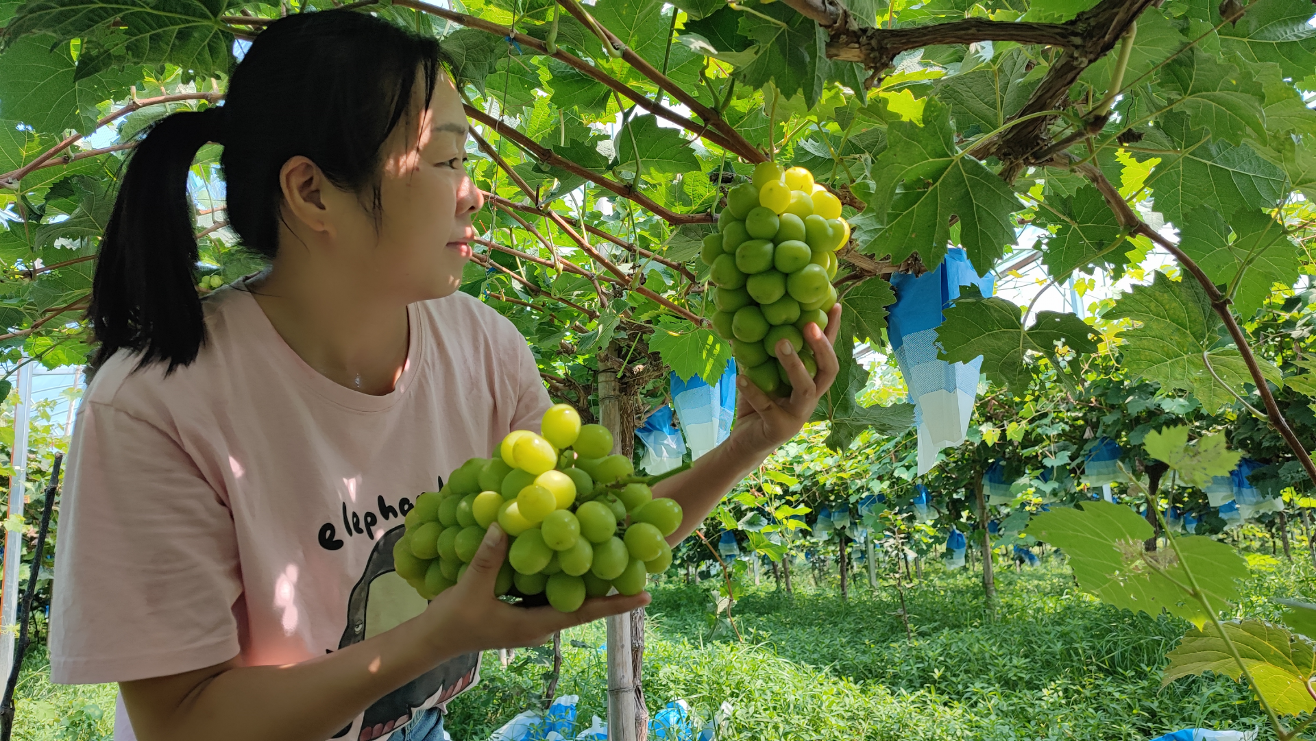 走進(jìn)葡萄園內(nèi),一串串套著紙袋的葡萄赫然映入眼前,輕輕取下紙袋,晶瑩剔透的葡萄翠綠中帶著金黃,在陽(yáng)光的照射下,宛如一顆顆璀璨的綠寶石,吸引眾多游客前來(lái)體驗(yàn)采摘樂趣。