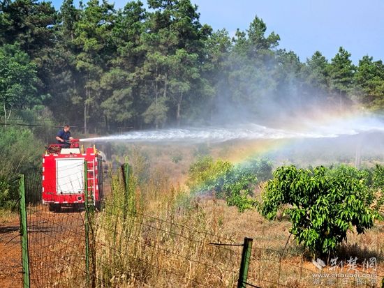 由于通行的路較窄,消防救援人員只能使用小型水罐消防車往返運(yùn)輸,保障30余畝果苗的澆灌用水。在鋪設(shè)水帶、連好水槍后,消防員們站在消防車車頂開始給柑橘苗種植區(qū)域進(jìn)行澆灌,只見一條“水龍”從水炮口噴射而出,在田間下了一場“及時雨”。