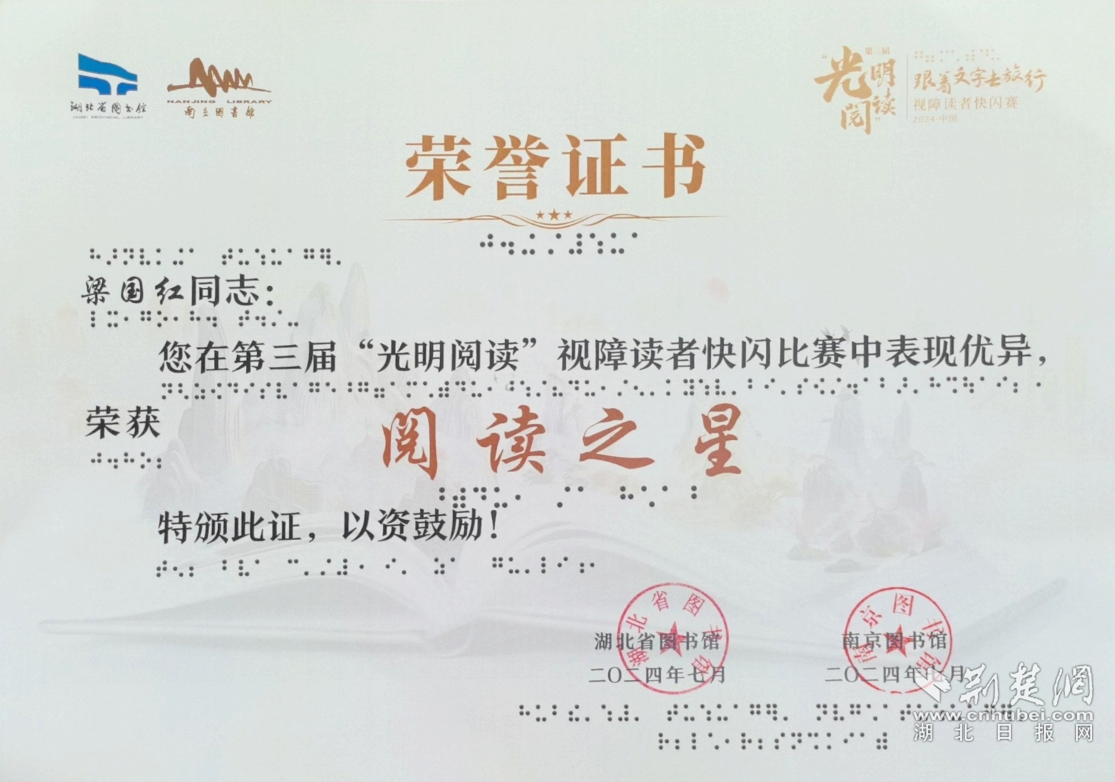荊楚網(wǎng)(湖北日報網(wǎng))訊(通訊員 吳凌)近日,第三屆全國”光明閱讀"快閃賽組委會公布獲獎名單,孝南區(qū)殘聯(lián)榮獲“優(yōu)秀組織獎”榮譽稱號,孝南區(qū)視障讀者代表梁國紅被評為省級”閱讀之星”,8月22日下午,孝南區(qū)殘聯(lián)為梁國紅及時送了喜報。