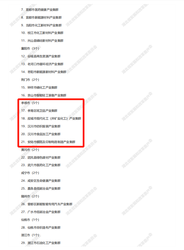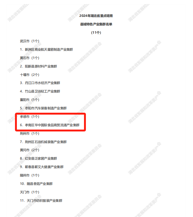 其中,孝南區(qū)紙衛(wèi)品產(chǎn)業(yè)集群、應(yīng)城市現(xiàn)代化工(井礦鹽化工)產(chǎn)業(yè)集群、漢川市紡織服裝產(chǎn)業(yè)集群、漢川市食品加工產(chǎn)業(yè)集群、安陸市銅箔及印制電路制造產(chǎn)業(yè)集群入選2024年湖北省縣域特色產(chǎn)業(yè)集群;孝南區(qū)華中國(guó)際食品商貿(mào)流通產(chǎn)業(yè)集群入選湖北省重點(diǎn)培育縣域特色產(chǎn)業(yè)集群名單。