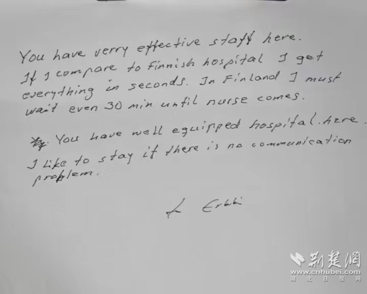 荊楚網(湖北日報網)訊(記者葉修頎 通訊員袁曼)9月8日,孝感市中心醫(yī)院呼吸與危重癥醫(yī)學科II病區(qū)的芬蘭患者羅斯塔蒂克在出院之際,留下了一封手寫感謝信,雖短短數(shù)語,卻是他由衷的感謝,字里行間,真情流露。