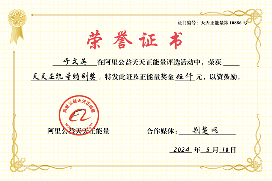 荊楚網(wǎng)(湖北日報網(wǎng))訊(記者呂鑒蕾 通訊員黃旺宣、文娜)9月10日,荊楚網(wǎng)(湖北日報網(wǎng))聯(lián)合阿里公益天天正能量,為“鑰匙姑娘”于文英頒發(fā)“天天正能量特別獎”,獎勵現(xiàn)金5000元。