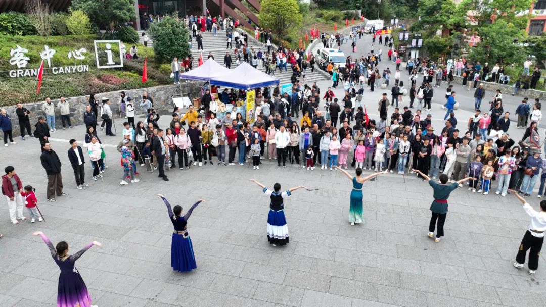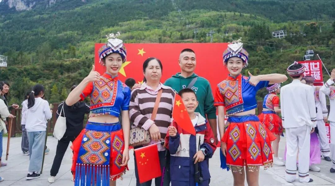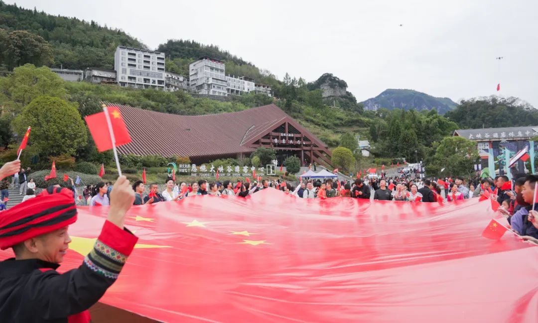 恩施大峽谷景區(qū)組織“盛世華誕 國(guó)旗飛揚(yáng)”快閃活動(dòng)。大型無人機(jī)懸掛國(guó)旗在峽谷飛行,游客同跳擺手舞,同唱《我和我的祖國(guó)》,現(xiàn)場(chǎng)游客激動(dòng)不已,歡呼聲、吶喊聲響徹整個(gè)峽谷。聊天式講解、鼓勵(lì)式爬山、還送拍照攝影服務(wù)的“陪爬”志愿者最“搶手”。假期間景區(qū)連續(xù)達(dá)到游客峰值。