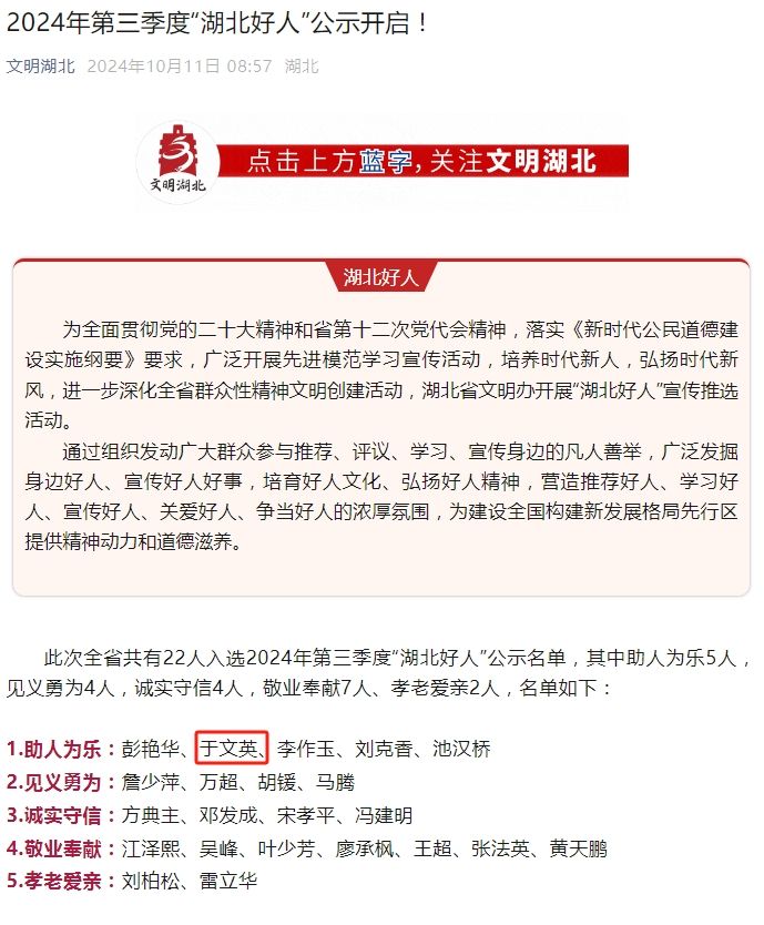 荊楚網(wǎng)(湖北日?qǐng)?bào)網(wǎng))訊(記者呂鑒蕾 通訊員黃旺宣、華文莉)10月11日,2024年第三季度“湖北好人”公示開啟,全省共有22人入選公示名單。其中,“鑰匙姑娘”于文英榜上有名。