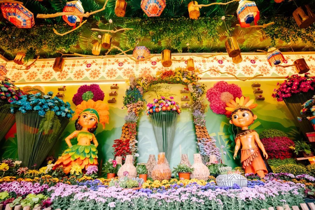 美洲館中異國菊花品種與南美洲文化的巨人石像、熱帶蜂鳥、巴西嘉年華IP、波利尼西亞人等元素相融合,展示了南美洲文化的獨(dú)特魅力,并通過菊花花展的形式向游客展示南美洲的藝術(shù)、美學(xué)和生活方式。