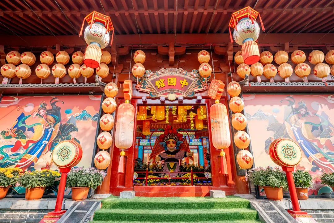 中國館以中國傳統(tǒng)曲藝為設(shè)計(jì)理念,以中國傳統(tǒng)戲臺(tái)為背景,擺放大量的精品菊花帶,中間身穿戲服的穆桂英與兩側(cè)演奏古典樂器的女子都采用乒乓菊扦插技術(shù)。曲藝與自然式花帶相結(jié)合,展現(xiàn)出一種神秘而美妙的意境,吸引游客沉浸其中,感受古代藝術(shù)與自然之美的交融。