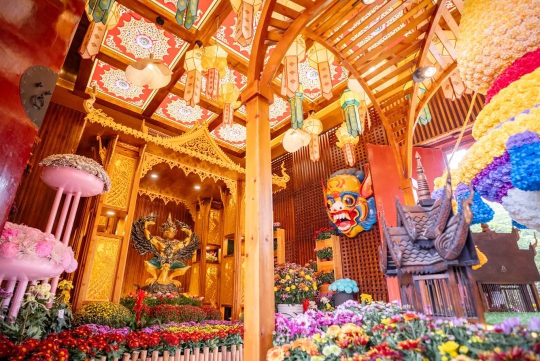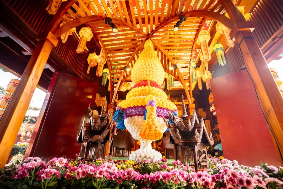 東南亞館將泰國文化與菊花巧妙結(jié)合,打造出一場(chǎng)異國風(fēng)情的菊花景點(diǎn),為游客帶來了解泰國文化和欣賞菊花美景的雙重體驗(yàn),主體部分用切花小菊扦插而成,布置各種色彩斑斕的菊花,結(jié)合泰國傳統(tǒng)花卉布置風(fēng)格,搭配泰國絲綢花布等裝飾,營造出濃郁的泰國風(fēng)味。