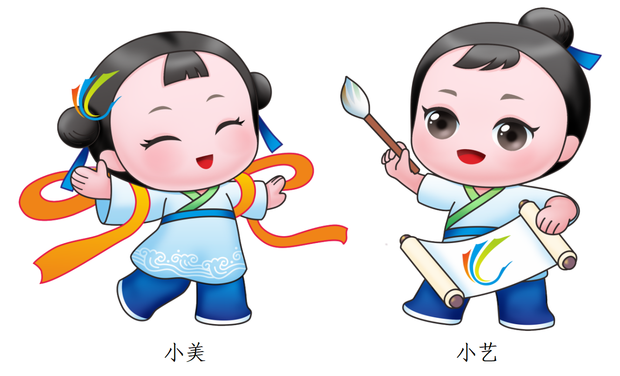 主體視覺以“創(chuàng)意與活力,藝術(shù)與青春”為設(shè)計理念,景泰藍為主色調(diào),配合多彩的美育節(jié)圖案,給人以熱烈、活潑、靈動、藝術(shù)的視覺感受,以表達青春的活力和藝術(shù)的多樣性??ㄍㄐ蜗蠹槲锩Q為小藝和小美,以大孝子董永與七仙女為設(shè)計原型,彰顯中國孝文化之鄉(xiāng)的美名?!靶∶馈迸宕髅烙?jié)頭飾,舞帶是七仙女的織衣,象征著美育節(jié)表演項目的神奇創(chuàng)造力。“小藝”手握毛筆宣紙,展現(xiàn)人文特色,象征藝術(shù)作品的非凡表現(xiàn)力。