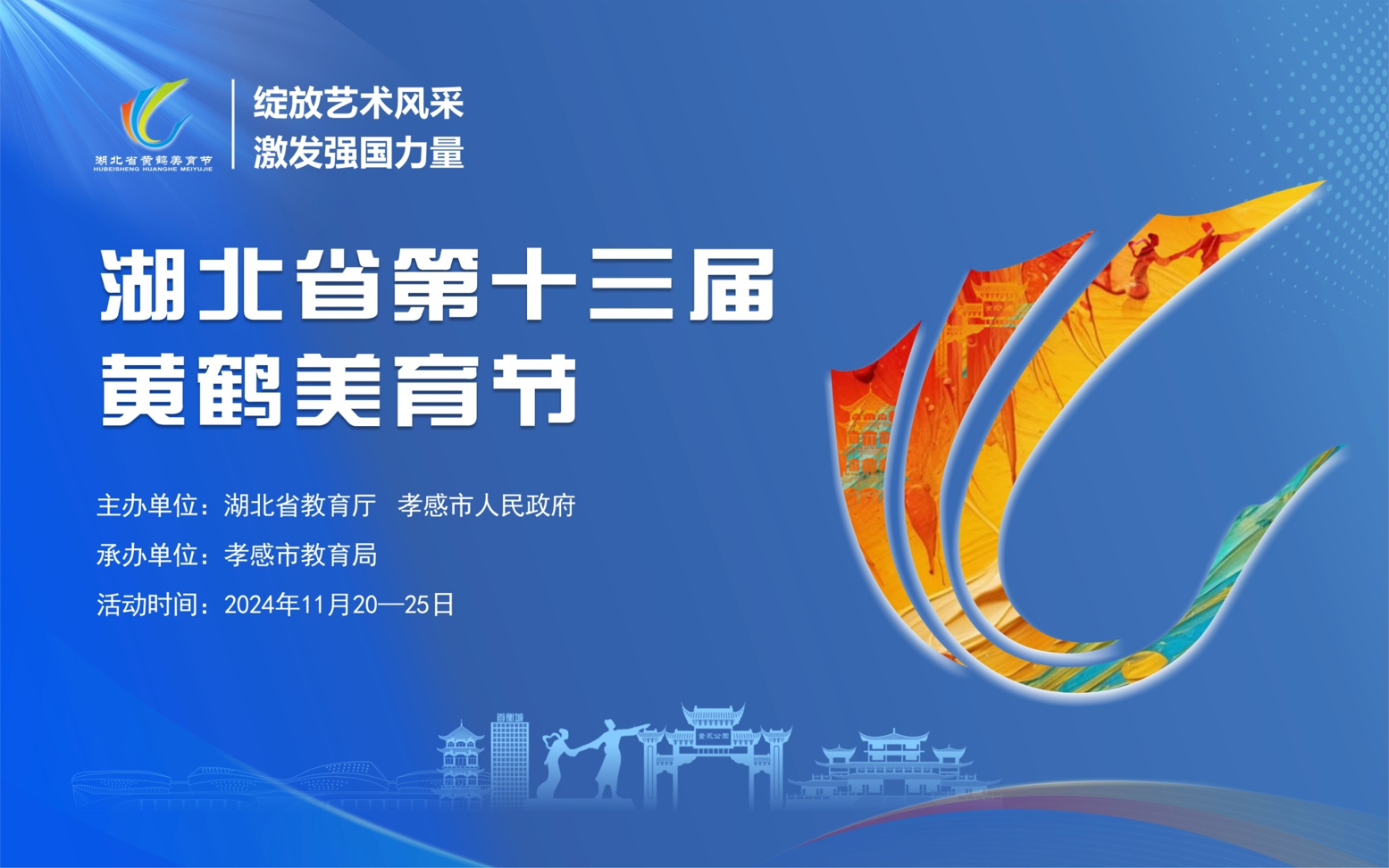 第十三屆黃鶴美育節(jié)以“綻放藝術(shù)風(fēng)采 激發(fā)強國力量”為主題,分各校、縣(市、區(qū))、市(州)活動、省級集中展演和全國現(xiàn)場展演三個階段開展。2024年11月20日至11月25日在孝感集中舉行黃鶴美育節(jié)開閉幕式和現(xiàn)場展演,共有來自全省17個市(州)中小學(xué)校、6000余名師生參加活動,1300余件作品進行展示。