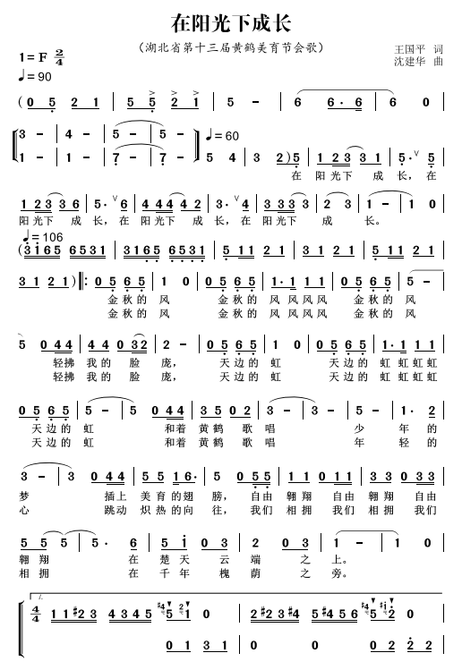 會歌《在陽光下成長》歌詞通俗、簡潔明了,獨具個性的標題“在陽光下成長”不但凸顯了湖北省黃鶴美育節(jié)活動的核心主題,同時也形象地表現(xiàn)了在黨的陽光照耀下少年兒童追求夢想、崇尚藝術(shù)、快樂成長的精神風(fēng)貌。