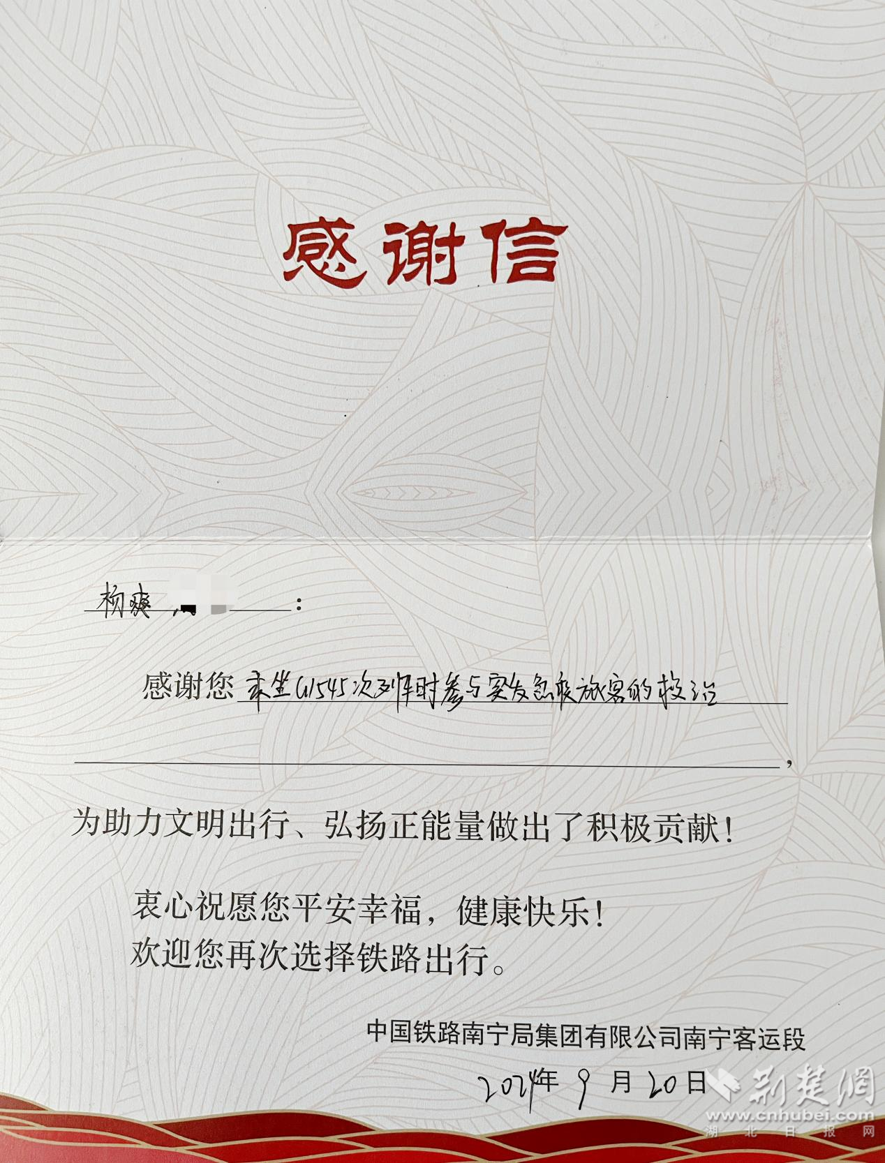 荊楚網(wǎng)(湖北日報網(wǎng))訊(記者葉修頎 通訊員羅津)10月19日,孝感市中心醫(yī)院骨科Ⅱ脊柱病區(qū)醫(yī)生楊爽收到了一份特殊的禮物——一封來自中國鐵路南寧局集團(tuán)有限公司南寧客運段的感謝信以及一款“鐵潮”文創(chuàng)背包,以感謝他的一次緊急救助行動。