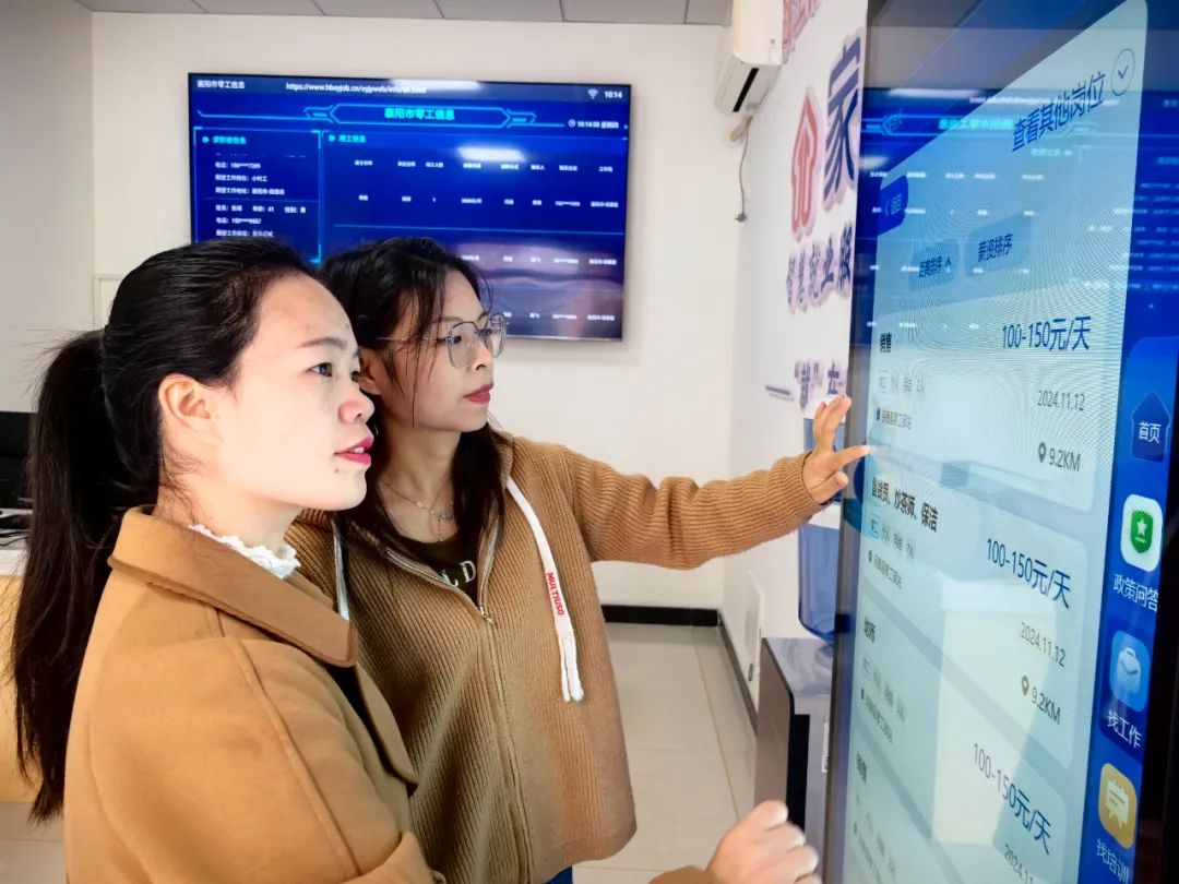 在這家智慧就業(yè)服務(wù)站,電子屏幕上不斷滾動(dòng)著企業(yè)招聘信息,導(dǎo)購(gòu)、保安、家政、人事專員等崗位信息密集,企業(yè)用工需求、薪資、工種一目了然。