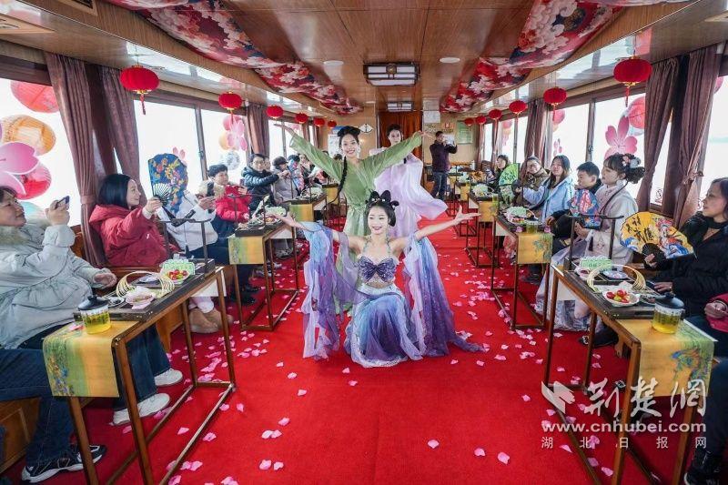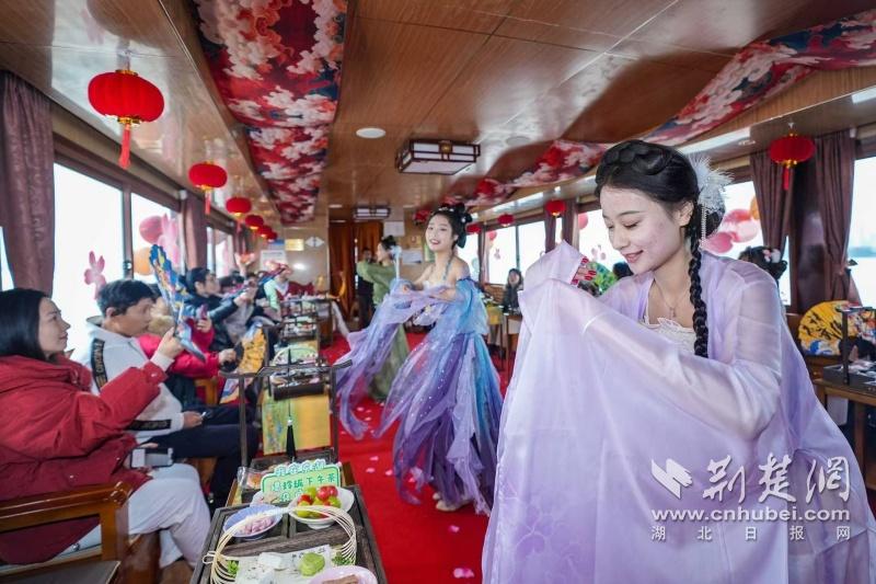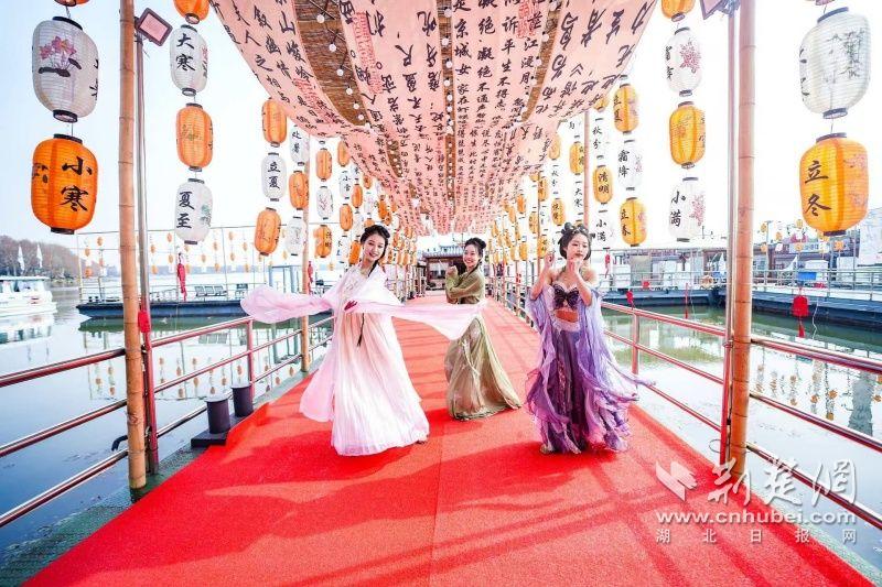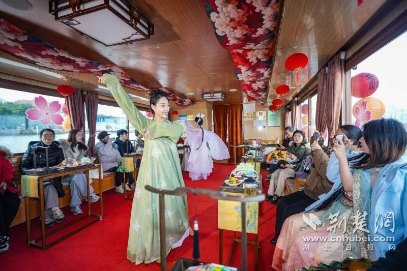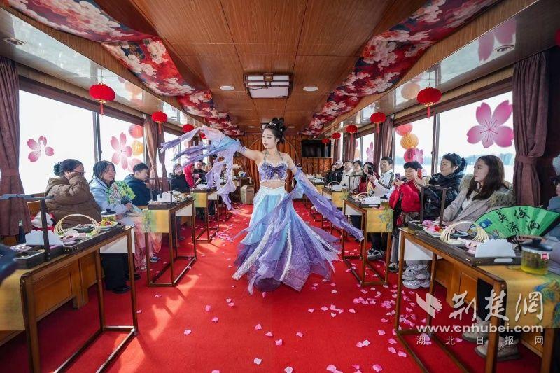 據(jù)介紹,全新上線的精品環(huán)湖游將為游客帶來沉浸式國(guó)風(fēng)演藝體驗(yàn),從楚風(fēng)園碼頭出發(fā),在游客登船之際,精彩好戲就已正式開鑼。畫舫離岸,演出開始,《元夕》《一面驚鴻》《錦瑟》等國(guó)風(fēng)舞蹈亮相甲板,表演者們霓裳蹁躚,或婉約柔美,或英氣颯爽,在游客面前隨著悠揚(yáng)楚樂,將楚舞的神韻演繹得絲絲入扣,不時(shí)還與游客隨機(jī)互動(dòng),同賀新春。