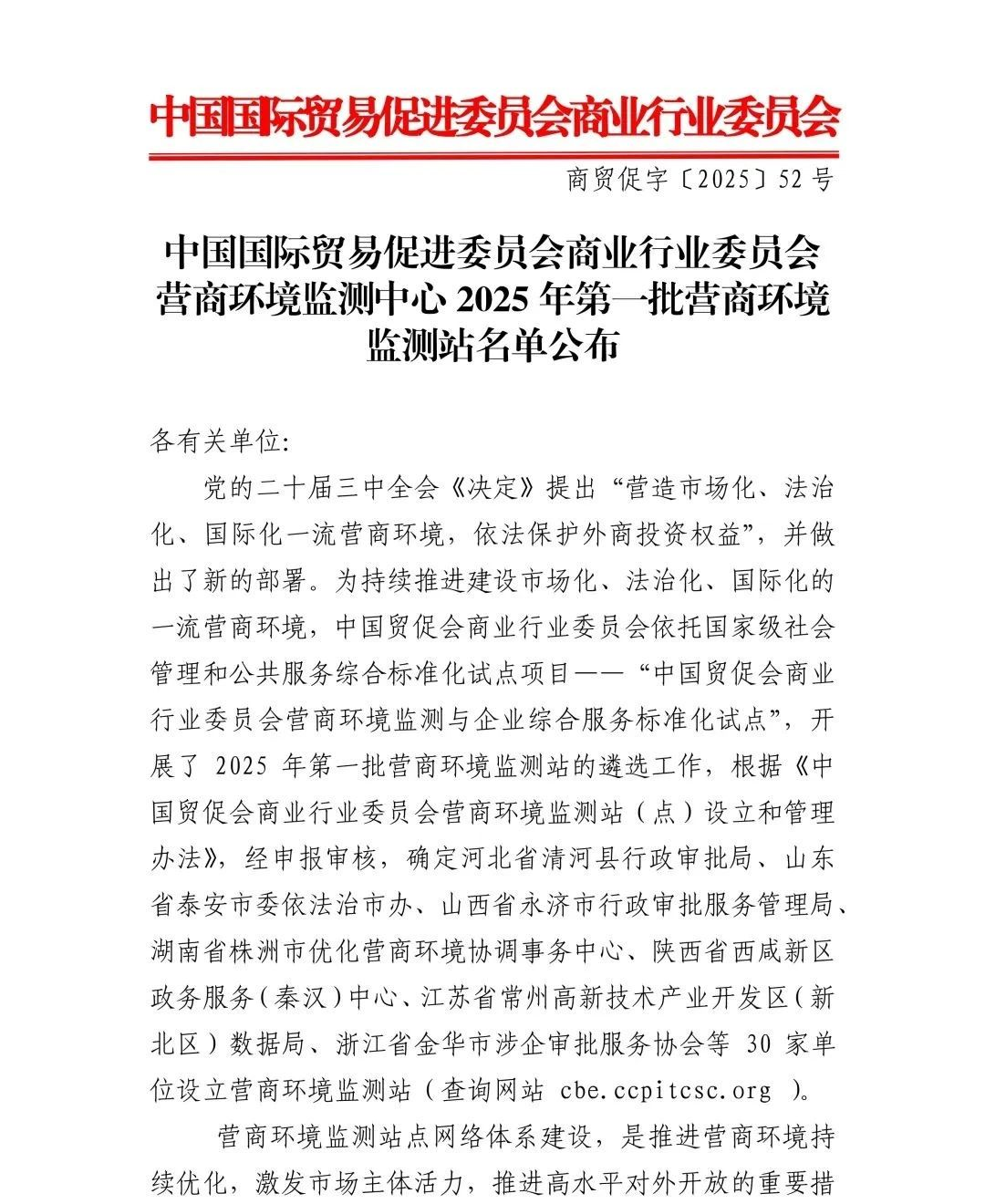為持續(xù)推進(jìn)建設(shè)市場化、法治化、國際化的一流營商環(huán)境,中國貿(mào)促會(huì)商業(yè)行業(yè)委員會(huì)依托國家級社會(huì)管理和公共服務(wù)綜合標(biāo)準(zhǔn)化試點(diǎn)項(xiàng)目——“中國貿(mào)促會(huì)商業(yè)行業(yè)委員會(huì)營商環(huán)境監(jiān)測與企業(yè)綜合服務(wù)標(biāo)準(zhǔn)化試點(diǎn)”,開展了2025年第一批營商環(huán)境監(jiān)測站的遴選工作,根據(jù)《中國貿(mào)促會(huì)商業(yè)行業(yè)委員會(huì)營商環(huán)境監(jiān)測站(點(diǎn))設(shè)立和管理辦法》,經(jīng)申報(bào)審核,確定湖北省孝感市孝南區(qū)營商環(huán)境促進(jìn)中心、河北省清河縣行政審批局、江蘇省常州高新技術(shù)產(chǎn)業(yè)開發(fā)區(qū)(新北區(qū))數(shù)據(jù)局、浙江省金華市涉企審批服務(wù)協(xié)會(huì)等30家單位設(shè)立營商環(huán)境監(jiān)測站。