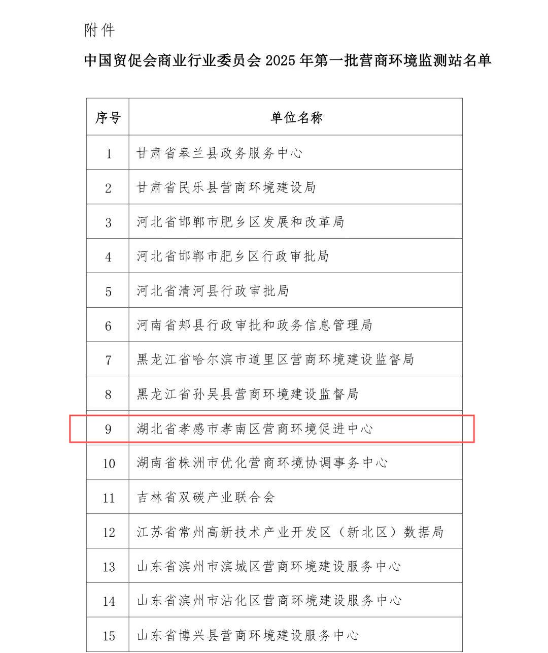 荊楚網(wǎng)(湖北日報(bào)網(wǎng))訊(通訊員 王佳玉)2月19日,中國國際貿(mào)易促進(jìn)委員會(huì)商業(yè)行業(yè)委員會(huì)公布了2025年第一批營商環(huán)境監(jiān)測站名單,孝南區(qū)營商環(huán)境促進(jìn)中心入選,為本次湖北省唯一入選縣市區(qū)。湖北首衡城農(nóng)產(chǎn)品有限公司、湖北港榮食品有限公司、湖北爽露爽食品股份有限公司、銘冠(湖北)包裝材料有限公司等30家企業(yè)入選營商環(huán)境觀測點(diǎn)。