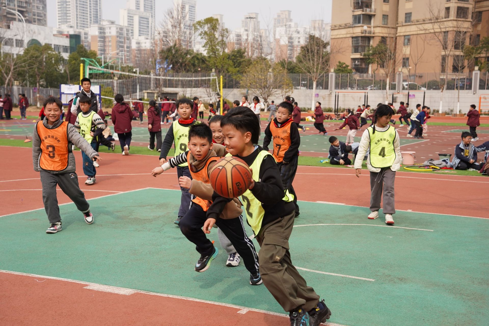 運球、突破、投籃……一場激烈的籃球比賽正在東湖實驗學校操場上進行,小球員們身著鮮艷的隊服,臉上洋溢著稚嫩卻堅定的神情。