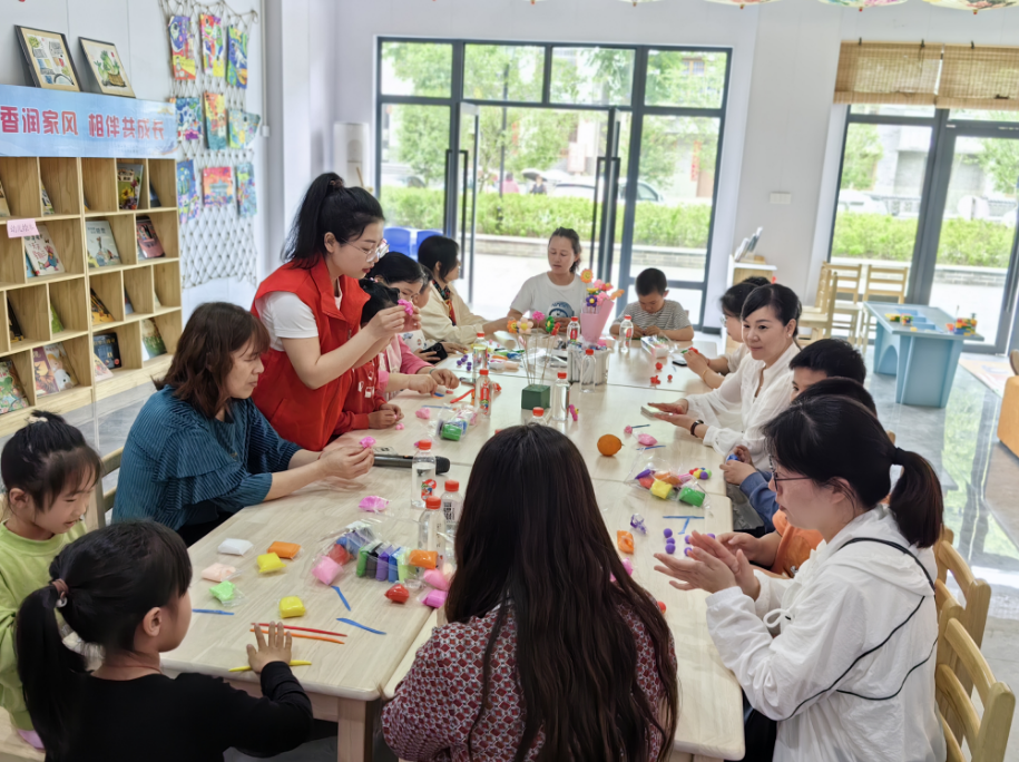 赤壁市羊樓洞村,愛心媽媽正在帶領(lǐng)孩子們做手工?!?/p>