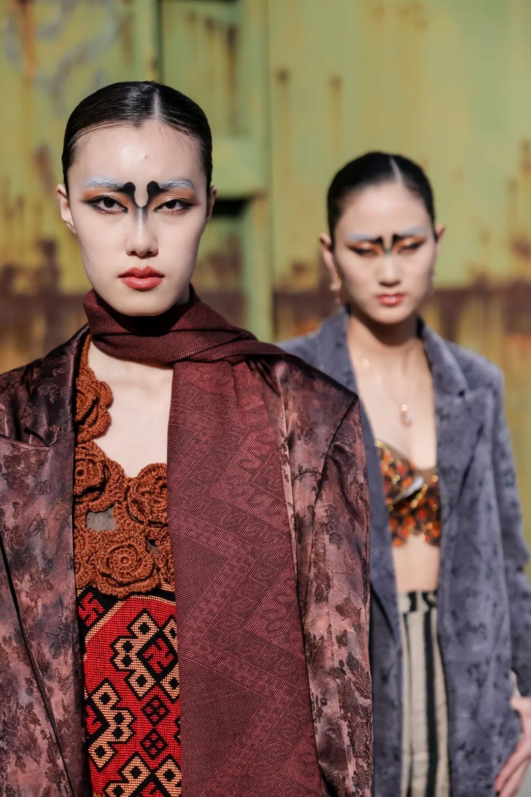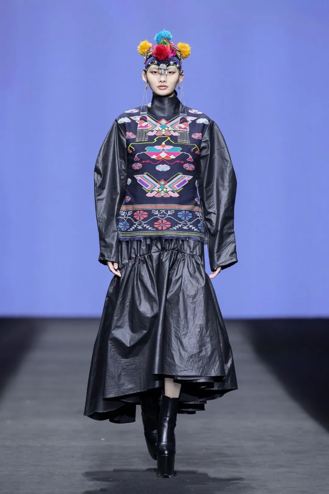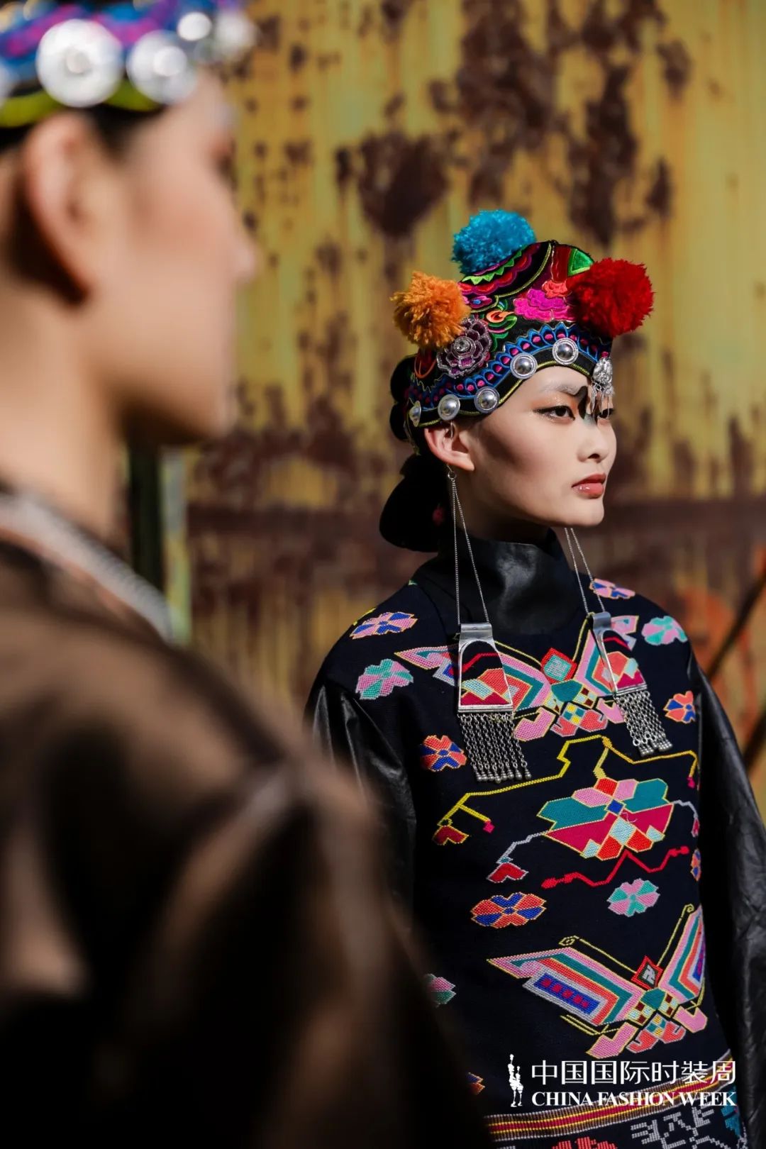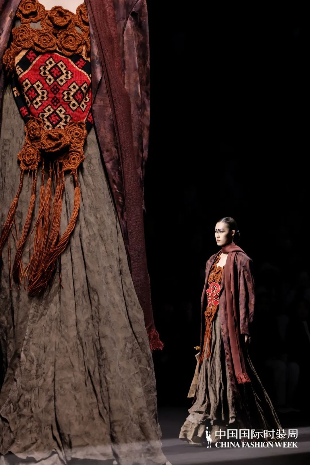 此次時裝周的核心設(shè)計團(tuán)隊(duì)由中國十佳時裝設(shè)計師、中國紡織非遺推廣大使馮三三領(lǐng)銜。主創(chuàng)團(tuán)隊(duì)從民間傳說中汲取靈感,巧妙地將西蘭卡普、香云紗、亮布等非物質(zhì)文化遺產(chǎn)面料與陽新布貼、絨花、苗繡等傳統(tǒng)手工藝相結(jié)合,讓古老的藝術(shù)煥發(fā)新生。