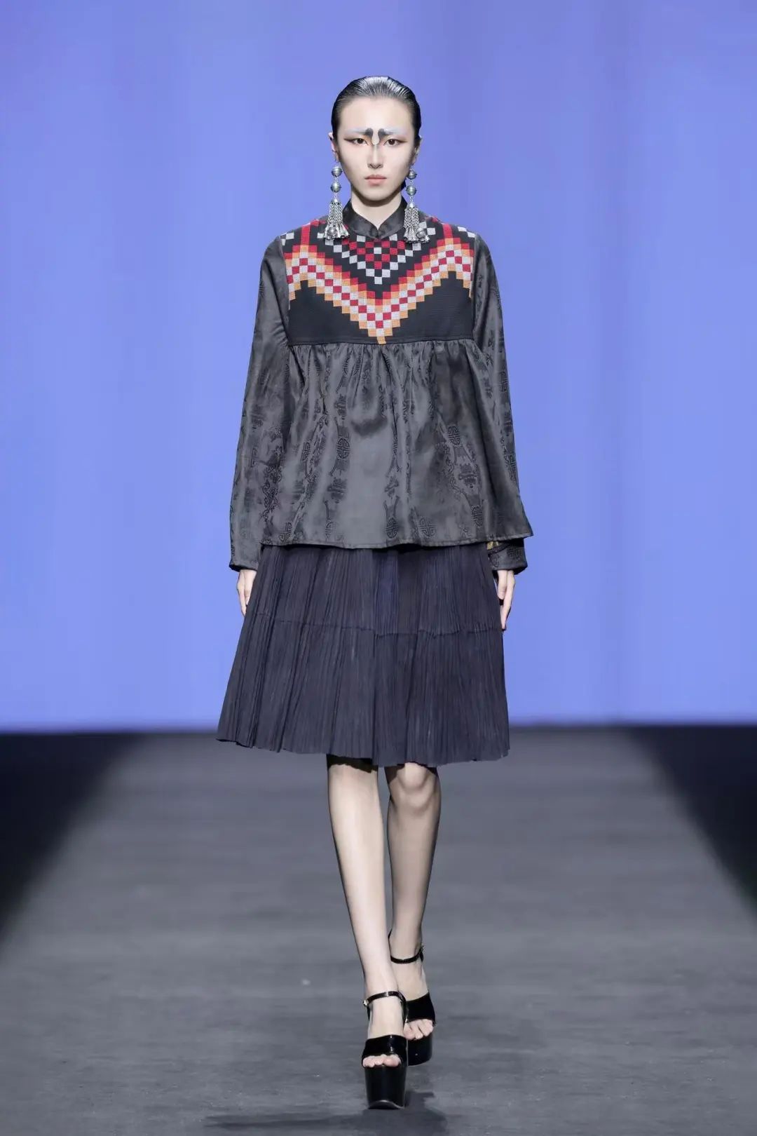 本次時裝周共展示了四大系列作品。其中,以西蘭卡普為核心元素的系列,憑借炫麗的色彩、精美的圖案和精湛的工藝,瞬間抓住眾人目光,為這場大秀注入了深厚文化內(nèi)涵,毫無懸念地成為全場焦點(diǎn)。這一系列作品的廓形設(shè)計流暢自然,與西蘭卡普的傳統(tǒng)圖案相互映襯、相得益彰,碰撞出奇妙火花,打造出一系列服裝臻品。它們既散發(fā)著濃郁的傳統(tǒng)韻味,又巧妙融入現(xiàn)代時尚美學(xué),在保留手工織錦原始質(zhì)感的同時,充分考量當(dāng)代人的審美理念,真正實(shí)現(xiàn)了傳統(tǒng)與現(xiàn)代的無縫對接與完美融合。