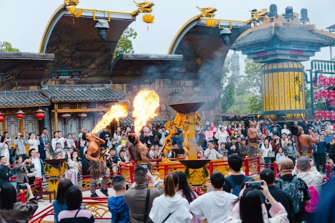 木蘭不夜城實(shí)景演繹、循環(huán)演出不間斷,噴火等絕技表演獲得了游客們的陣陣掌聲;《楚地長(zhǎng)歌》花魁、茶鋪掌柜、店小二、浣紗女NPC街頭“飆戲”,吸引了游客朋友們互動(dòng)打卡,人氣火爆。