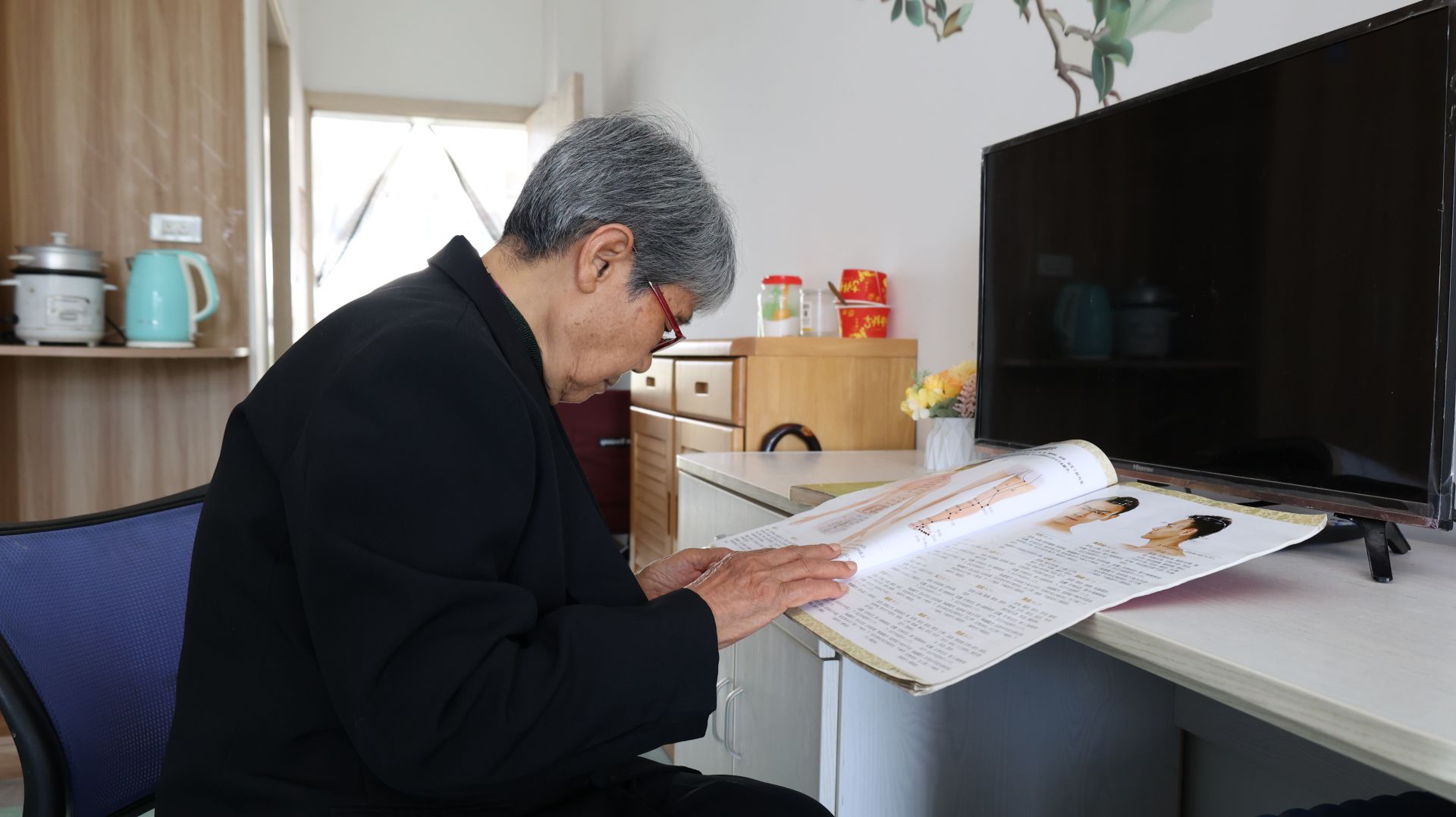 楊奶奶正在看穴位保健書。舒俊杰 攝