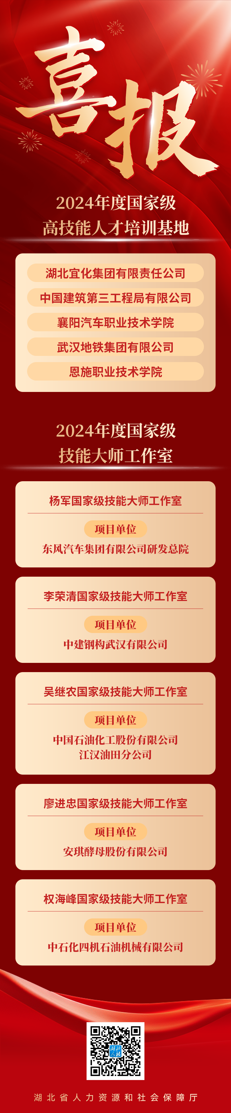 近期,人力資源社會保障部辦公廳、財政部辦公廳公布2024年國家級高技能人才培訓基地和技能大師工作室項目單位備案名單,湖北省5家國家級高技能人才培訓基地、5家國家級技能大師工作室入選。