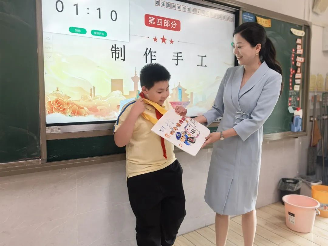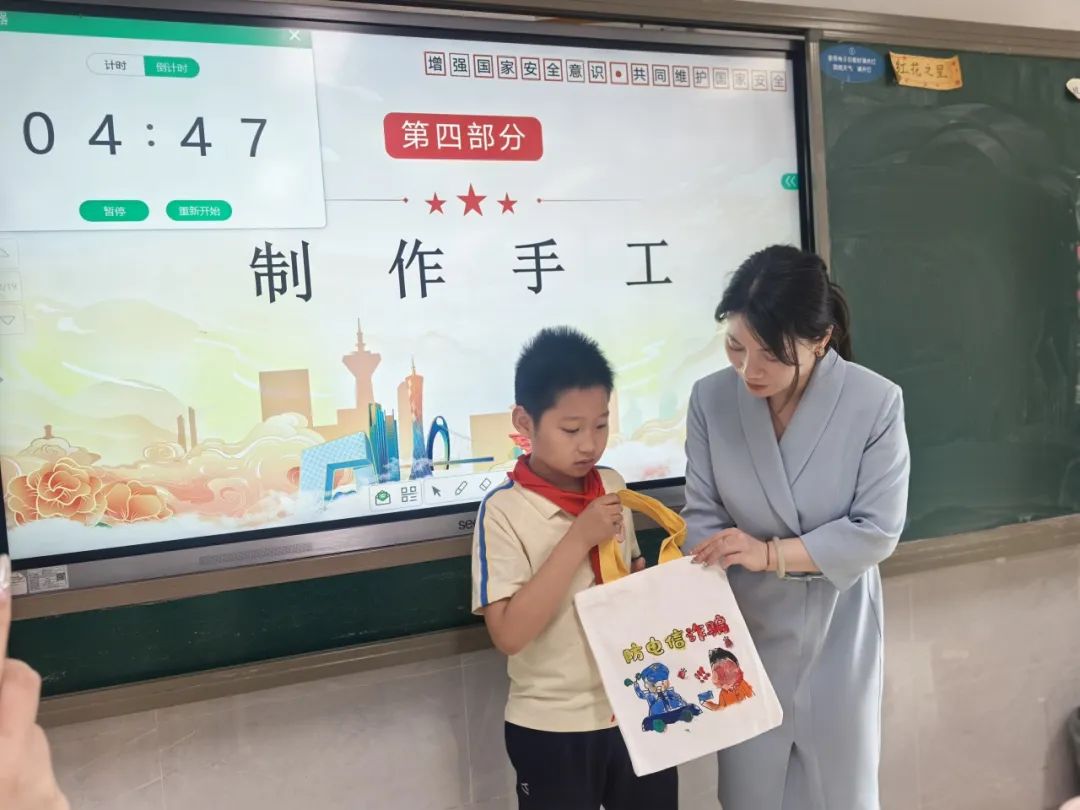 活動中,同學們還拿起水彩筆DIY安全教育主題帆布袋。他們有的繪制象征國家安全的盾牌與長城,有的描繪交通安全標志,還有的寫下“國家安全,人人有責”的標語。一幅幅童趣盎然的畫作,將抽象的安全理念轉(zhuǎn)化為看得見的行動宣言。許多同學表示:“這個帆布袋要每天帶著,提醒自己做個安全小衛(wèi)士!”