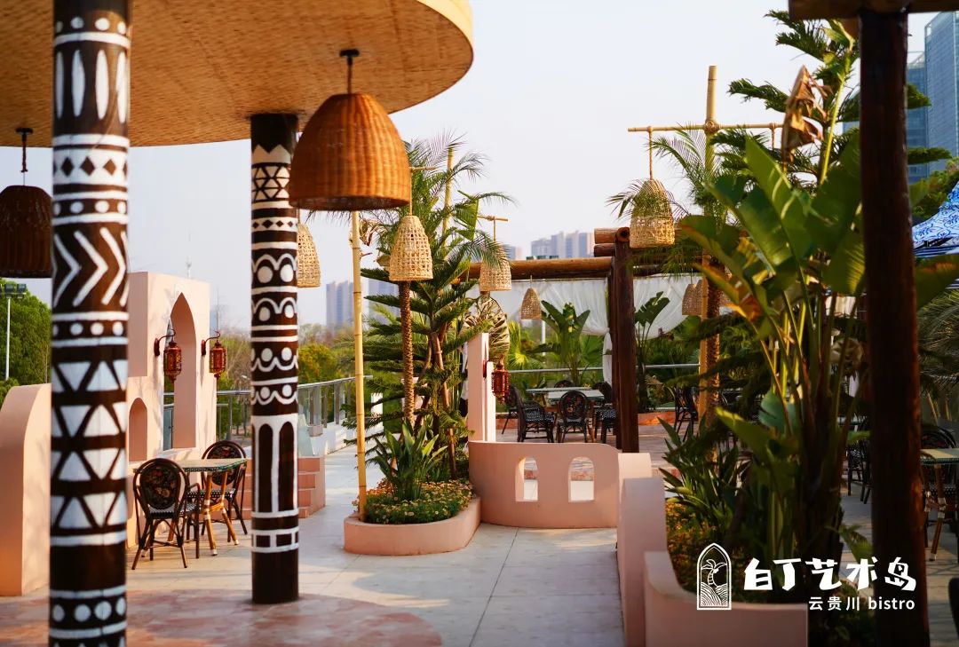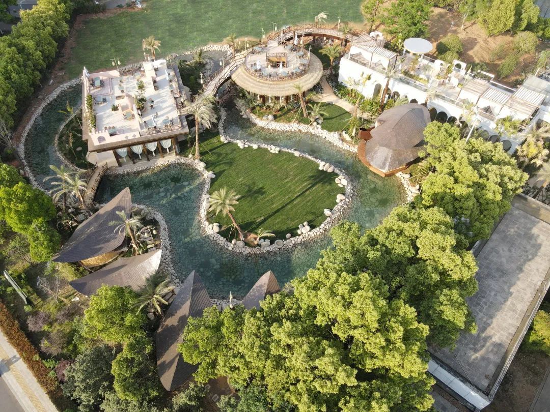 白丁藝術(shù)島坐落于武漢國際體育文化休閑園內(nèi),總占地面積近4000m2。踏進(jìn)這座蘊含東南亞風(fēng)情的神秘小島,組合式藝術(shù)空間藏在繁茂的熱帶植物中,近200米長的生態(tài)水系蜿蜒貫穿,法式南洋風(fēng)情藝術(shù)空間群由連廊貫通,筆直的中東海藻、加那利海棗高大挺拔。