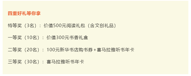 優(yōu)秀作品將獲新華書店購書券、喜馬拉雅聽書年卡、智能地球儀等獎勵,并在官方平臺展播!
