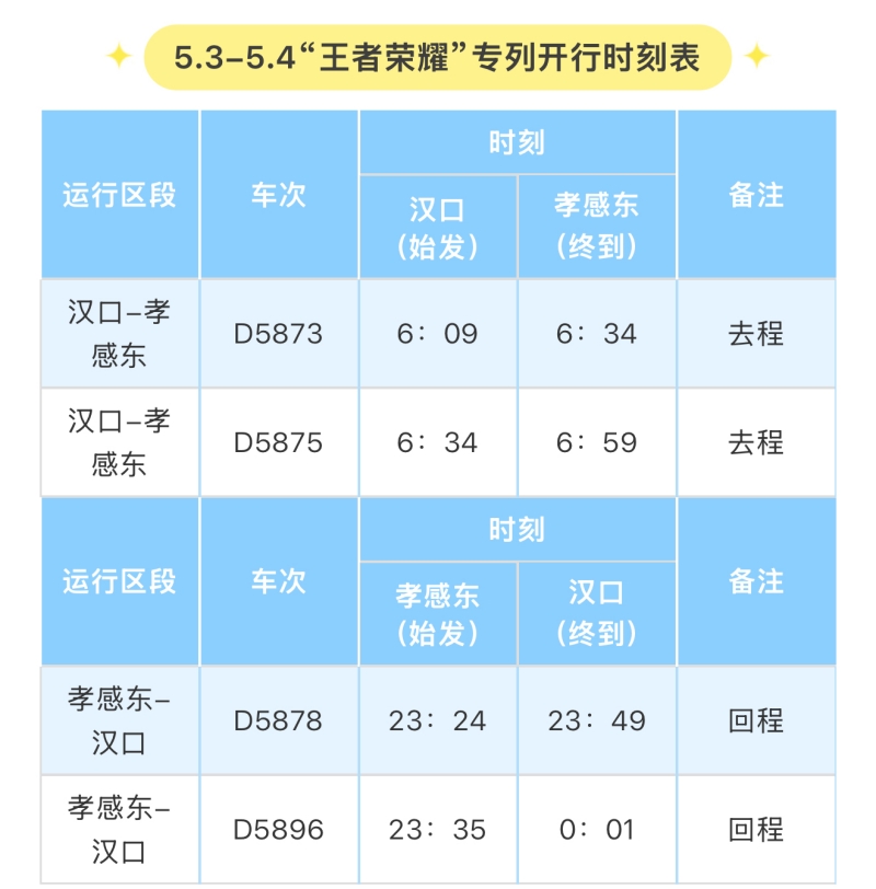 “王者榮耀專列”(5月3日和5月4日),每日安排四趟為您免費(fèi)服務(wù),在漢口站、孝感東站、孝感奧體中心專列服務(wù)臺領(lǐng)取“王者榮耀專列乘車證”直接進(jìn)出站乘車,數(shù)量有限,先到先得,送完為止!具體時刻表如下: