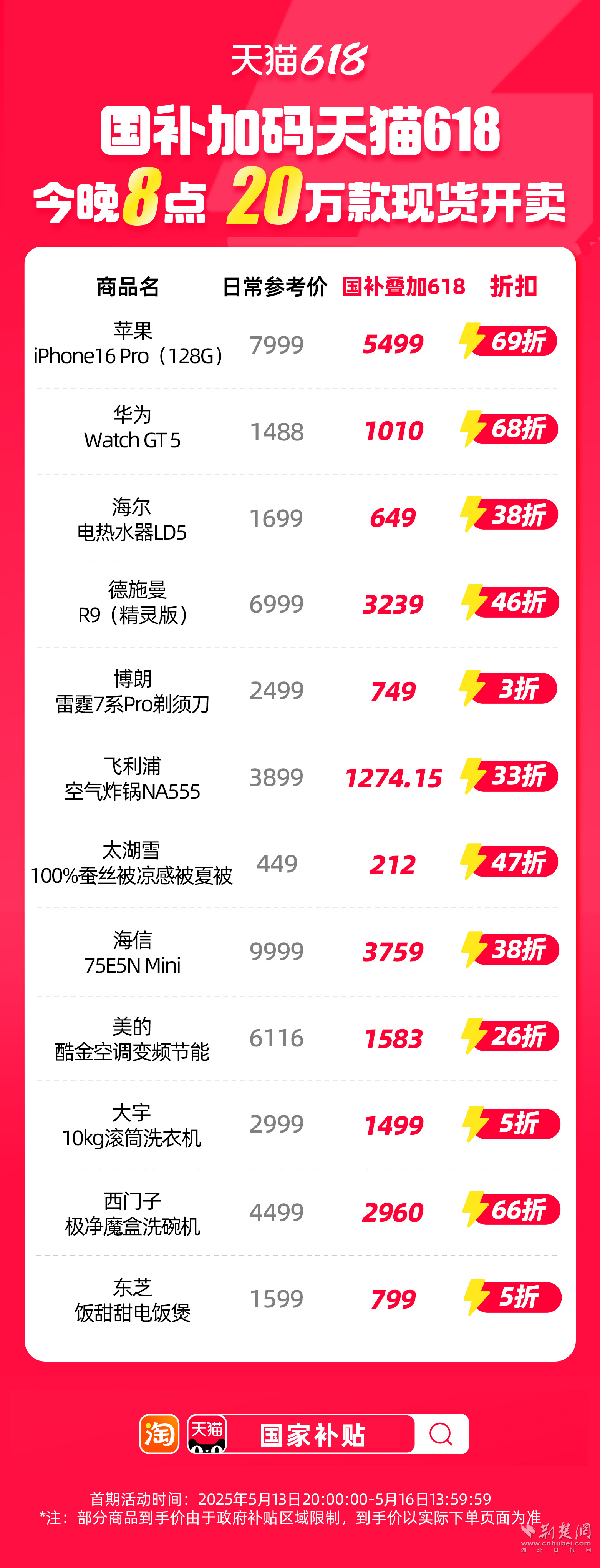 荊楚網(wǎng)(湖北日報網(wǎng))訊(通訊員 朱飛)天貓618重磅加碼國補,家電、家裝、家居、3C數(shù)碼等品類將低至5折,今晚8點,現(xiàn)貨開賣。