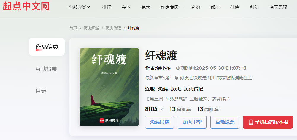 5月30日凌晨,巴東籍學(xué)者、武漢體育學(xué)院新聞傳播學(xué)院副教授侯小琴的長(zhǎng)篇?dú)v史小說(shuō)《纖魂渡》在起點(diǎn)中文網(wǎng)正式上線。該作品以民國(guó)時(shí)期巴東傳奇人物宋三姐為主線,生動(dòng)刻畫(huà)了長(zhǎng)江上游民眾搏浪斗匪、抗日救亡的壯闊歷史,填補(bǔ)了川江流域民國(guó)敘事的文學(xué)空白。
