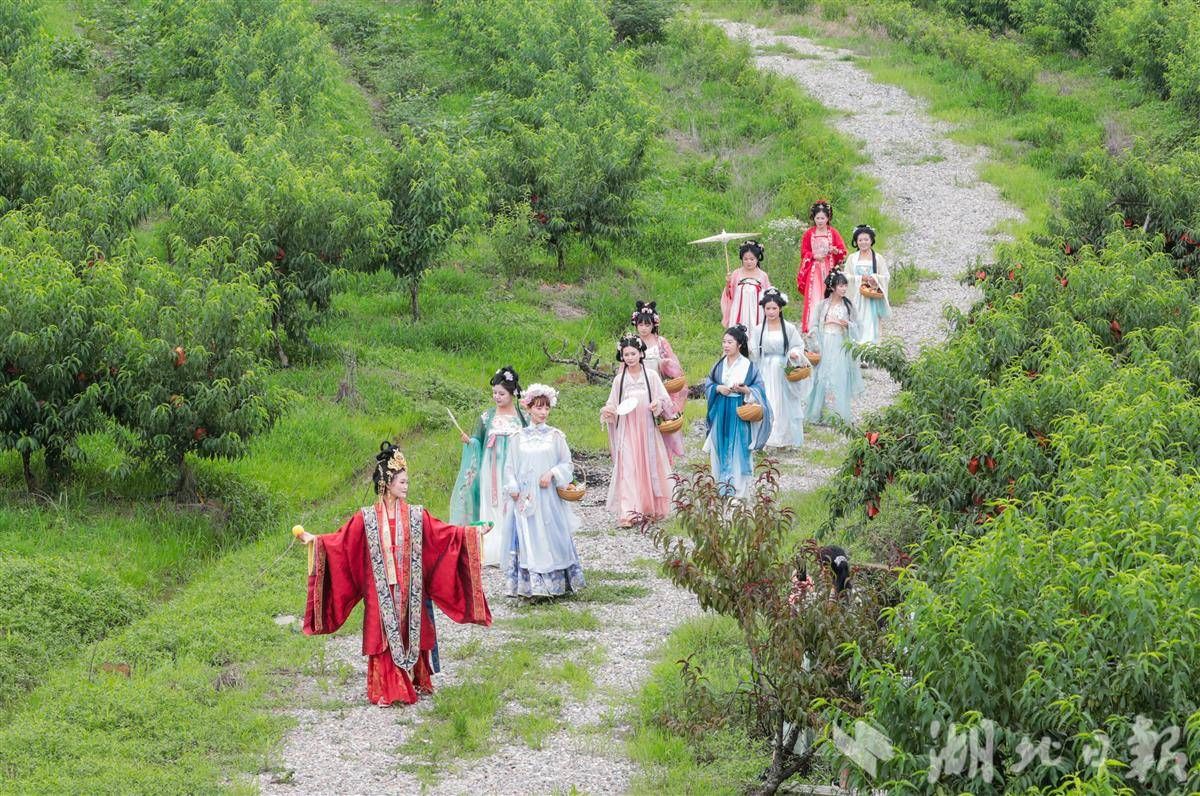6月10日,身穿漢服的演員在卓爾桃花驛小鎮(zhèn)的桃園里巡游。(湖北日報通訊員 陳超 攝)