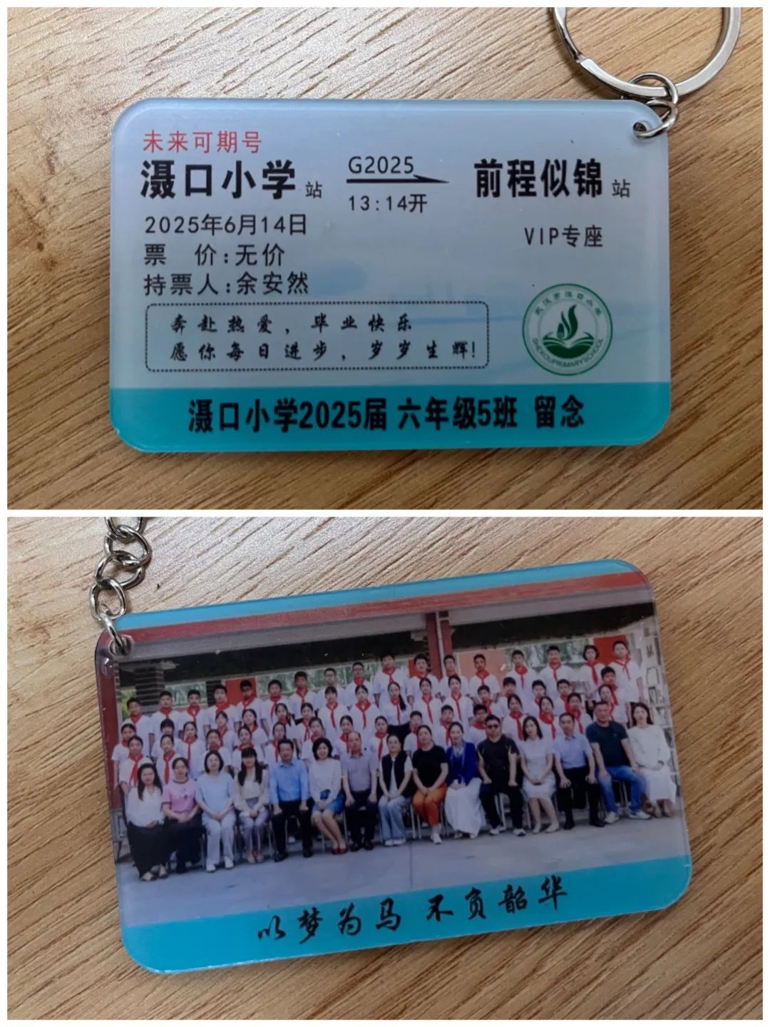 這張“火車票”不簡單,是獨一無二的定制款!這趟車叫“未來可期號”,車次是G2025,從“灄口小學(xué)”站開往“前程似錦”站。發(fā)車時間特意定在6月14日13時14分,這是孩子們在校的最后一天,意義非凡!每張票上都印著?;眨制比耸呛⒆觽兊拿?。票價那一欄寫著“無價”,座位更是“VIP專座”,滿滿都是我對他們的愛和期許!