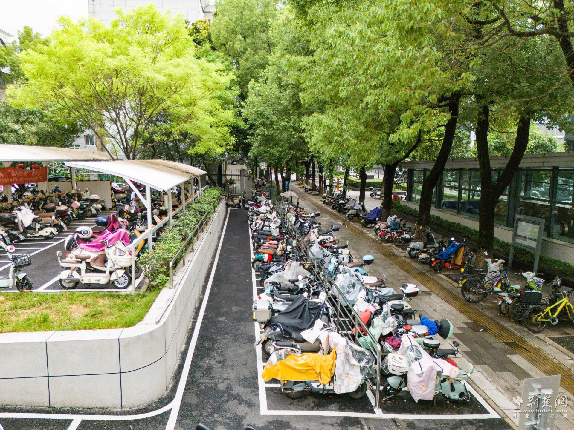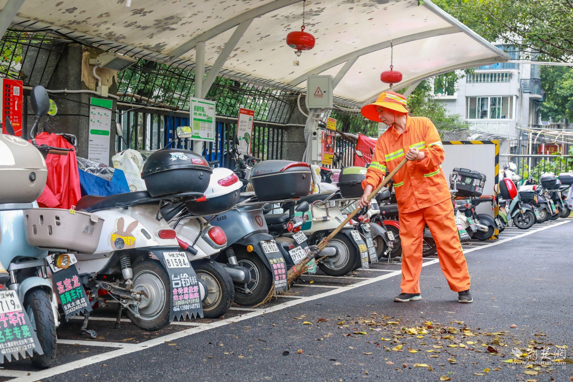 體育中心一帶人流密集,周邊高校、商圈、居民區(qū)扎堆,非機動車保有量大,亂停亂放、私拉亂接的現(xiàn)象一度突出?!霸缤砀叻宓臅r候,電動車能‘插’到哪就停到哪,充電線從窗戶、欄桿上扯下來,既不安全也不好管?!必撠熯@一片區(qū)巡查的城管隊員陳強說,最多的時候一條路邊能擠幾十輛車。