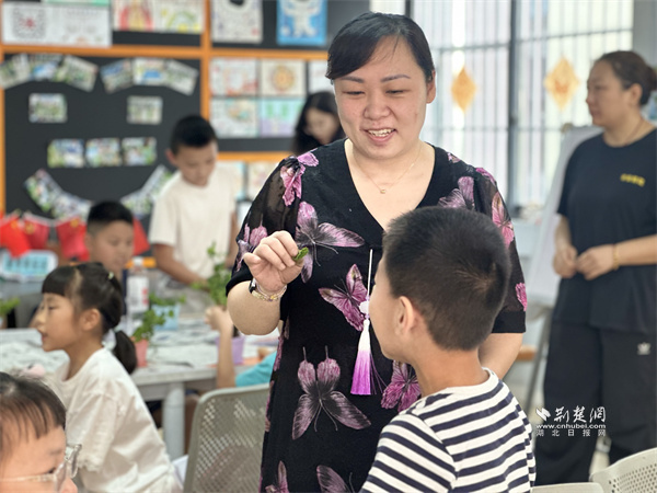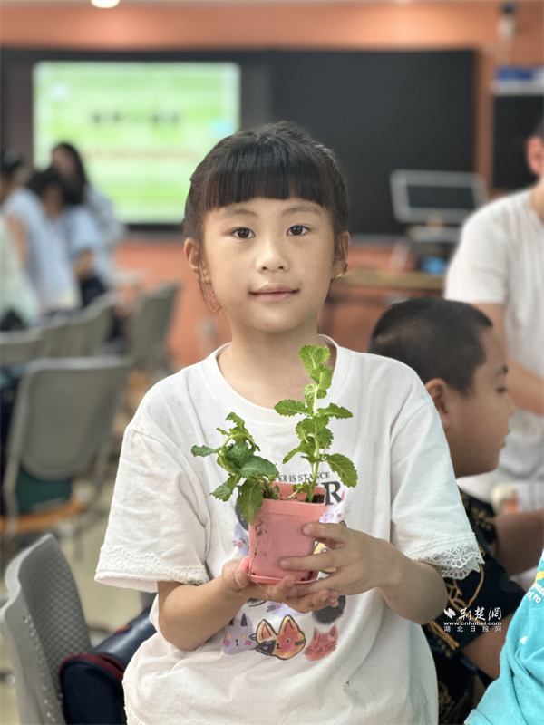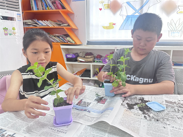 種植環(huán)節(jié)中,周帆帶著薄荷苗、花盆和泥炭土,手把手指導填土、定植、澆水。孩子們邊操作邊交流,指尖沾著泥土也興致勃勃。武漢市青山區(qū)鋼城第十九小學學生彭思瑞笑言:“我是托管班‘老學員’,連續(xù)三年參加暑期托管班,在這里上課比打游戲更有成就感,泥土的味道讓我很放松。”