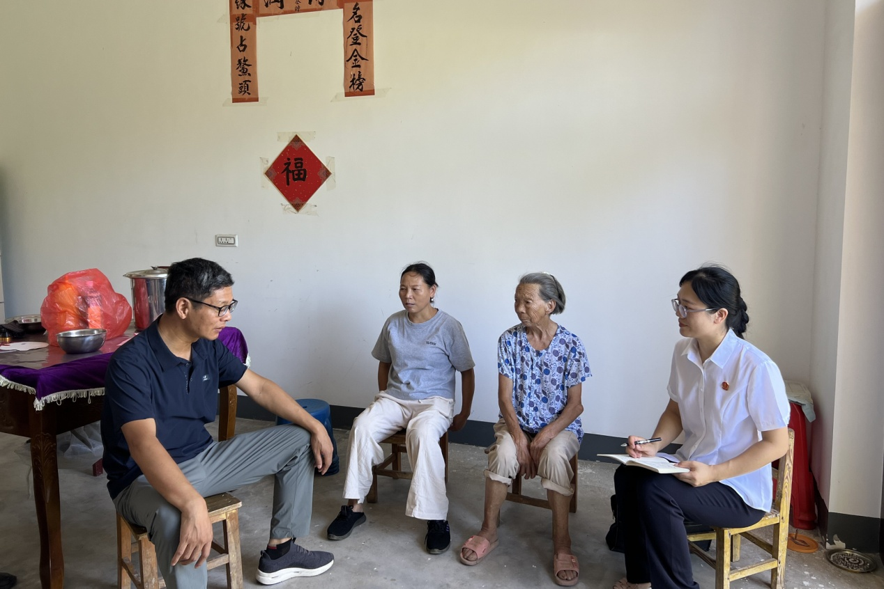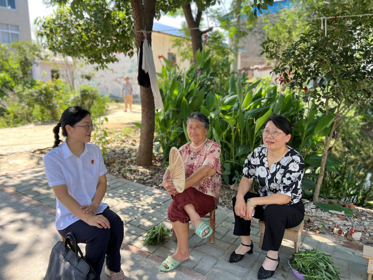 在村路邊的大樹底下,詹伍權(quán)主席與李舒庭長(zhǎng)遇到一位乘涼的老奶奶,兩人主動(dòng)上前噓寒問暖,詳細(xì)詢問老人的身體狀況、家庭生活及養(yǎng)老保障情況,叮囑老人注意夏季防暑,并結(jié)合老年人權(quán)益保障法,告知其在贍養(yǎng)、醫(yī)療等方面的合法權(quán)益及維權(quán)途徑。