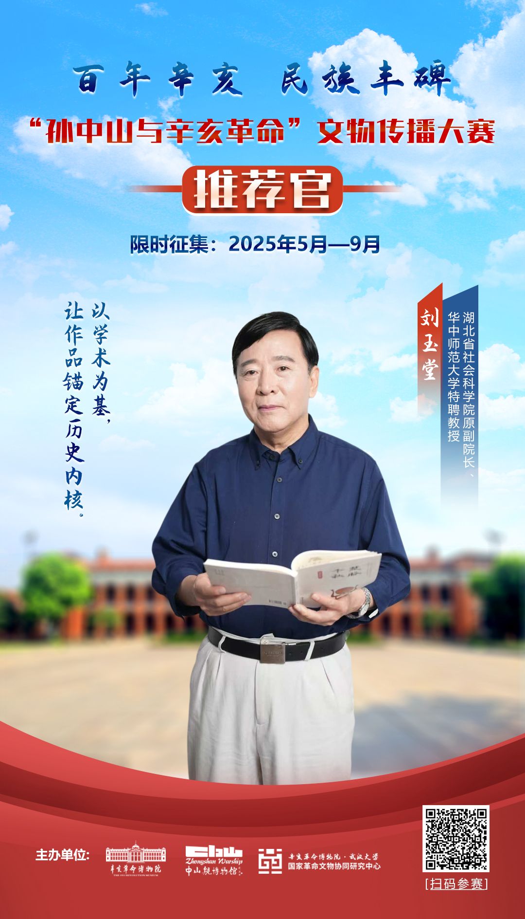 作為湖北省社會(huì)科學(xué)院原副院長(zhǎng)、華中師范大學(xué)特聘教授,劉玉堂教授深耕歷史領(lǐng)域數(shù)十載。作為評(píng)委,他將以深厚的學(xué)術(shù)積淀為評(píng)審標(biāo)準(zhǔn),從文物的歷史語境出發(fā),審視作品是否精準(zhǔn)提煉辛亥志士的革命精神內(nèi)核、是否具備歷史厚重感與說服力。