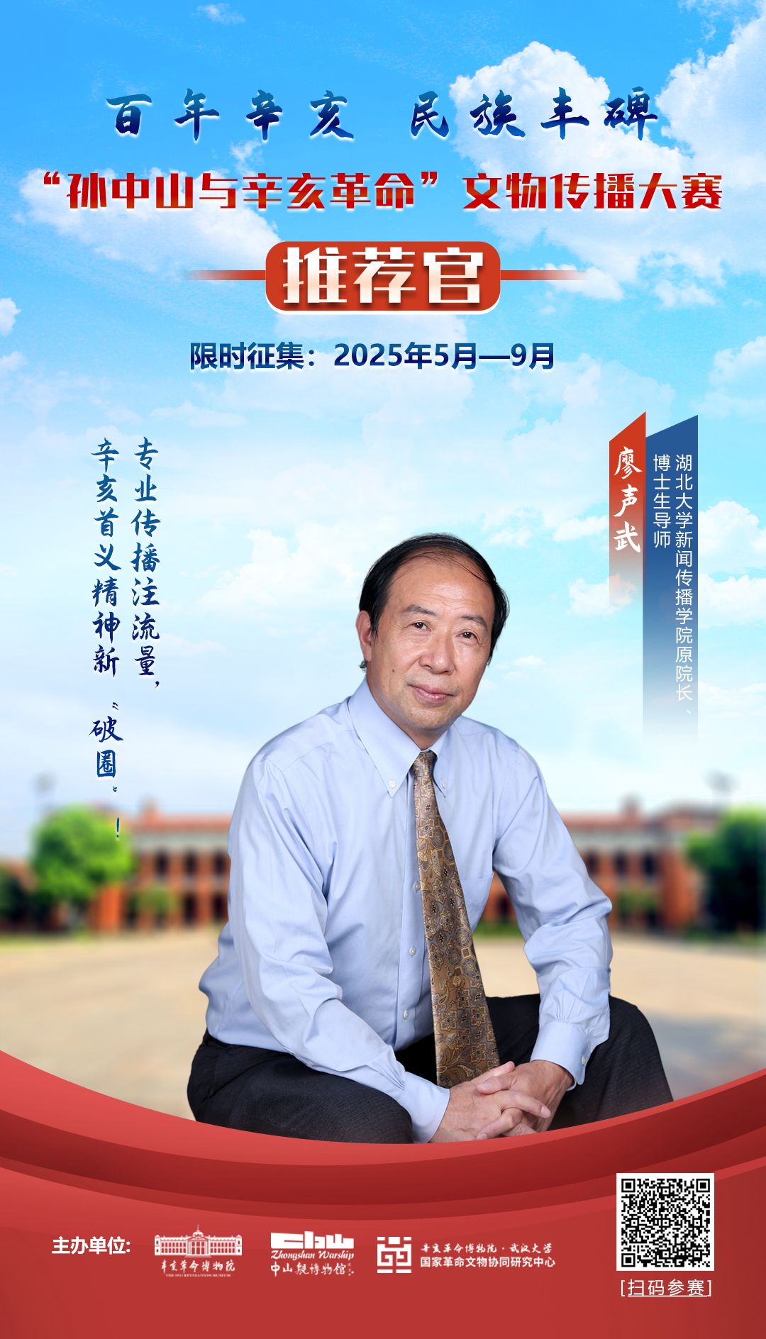 湖北大學(xué)新聞傳播學(xué)院原院長(zhǎng)廖聲武教授,深諳傳播之道。作為評(píng)委,他將從傳播邏輯、表達(dá)形式等角度評(píng)審:作品是否用大眾能理解、愿接受的方式講述歷史,作品是否具備“破圈”潛力,讓辛亥首義精神被更廣泛的群體看見、記住。
