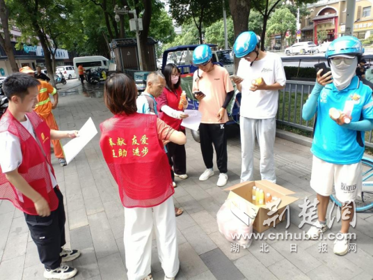 “師傅,喝瓶冰水,記得防暑啊。”活動(dòng)現(xiàn)場(chǎng),紅馬甲志愿者將冰鎮(zhèn)礦泉水、藿香正氣液、降溫貼等防暑用品一一遞到外賣員、快遞小哥和環(huán)衛(wèi)工人手中。為了照顧騎手等餐時(shí)間短、流動(dòng)頻繁的特點(diǎn),社區(qū)提前將綠豆湯和糕點(diǎn)送至暖新驛站,實(shí)現(xiàn)“人找貨”變“貨找人”,當(dāng)天共為50多位戶外勞動(dòng)者送上了這份貼心清涼。