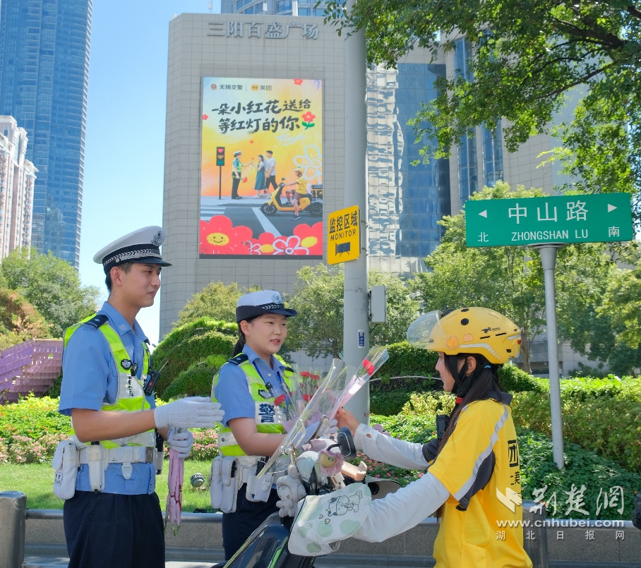 圖為:江蘇省無錫市中山路附近,兩位城市交警現(xiàn)場為騎手送小紅花,倡導(dǎo)安全出行。